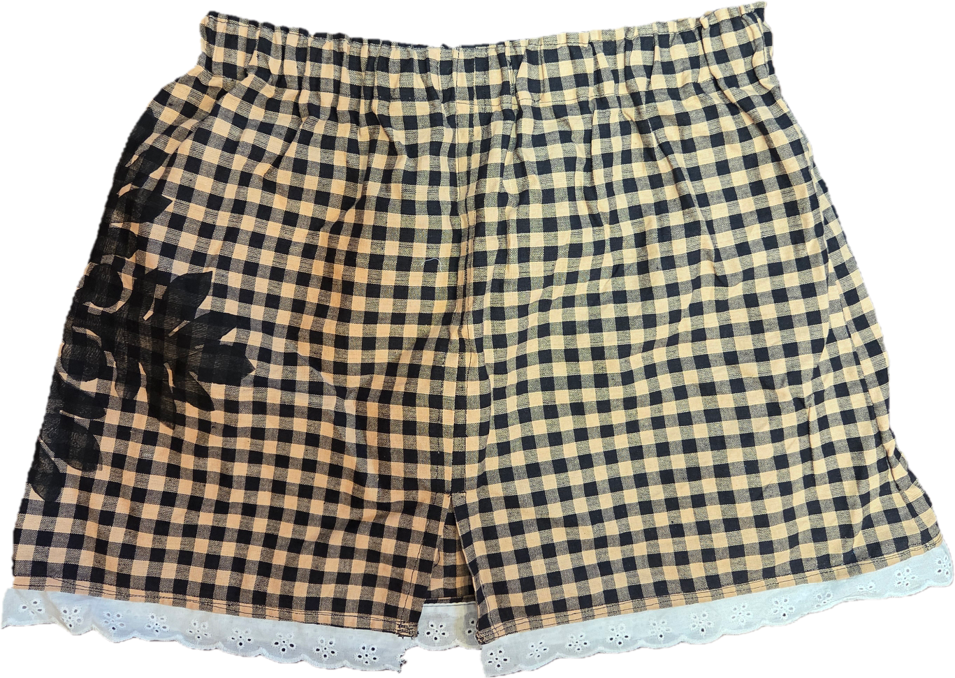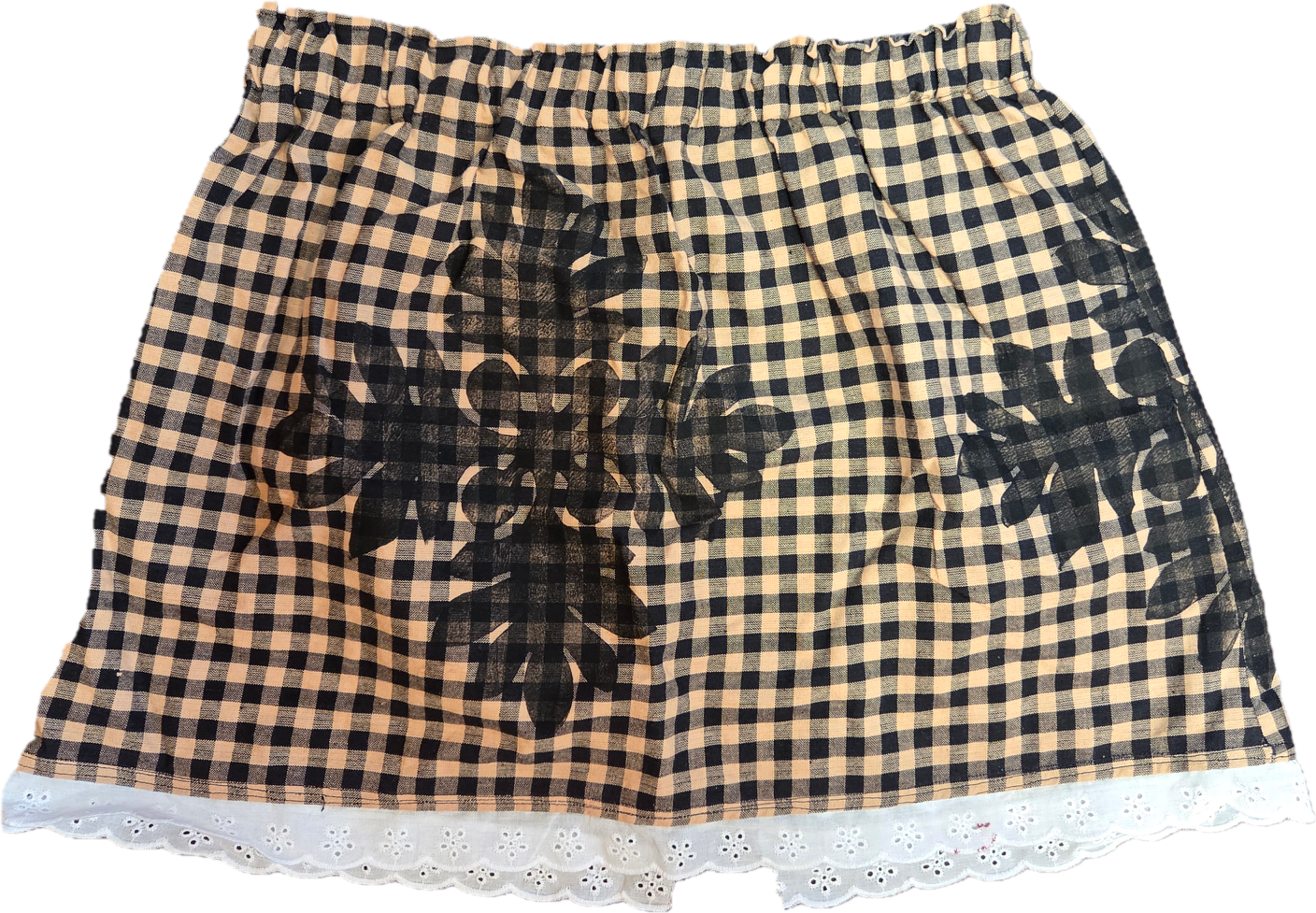 Introducing our hand-stamped Kapa Kuiki block print Wahine U'i Top. Designed using a black and tan gingham fabric and handstamped Kapa Kuiki in black on front and back. All stamps are hand-carved by us to offer a distinct style. This top is a size extra small - small measuring at approximately 14” - 20” across the front and 15” in length.