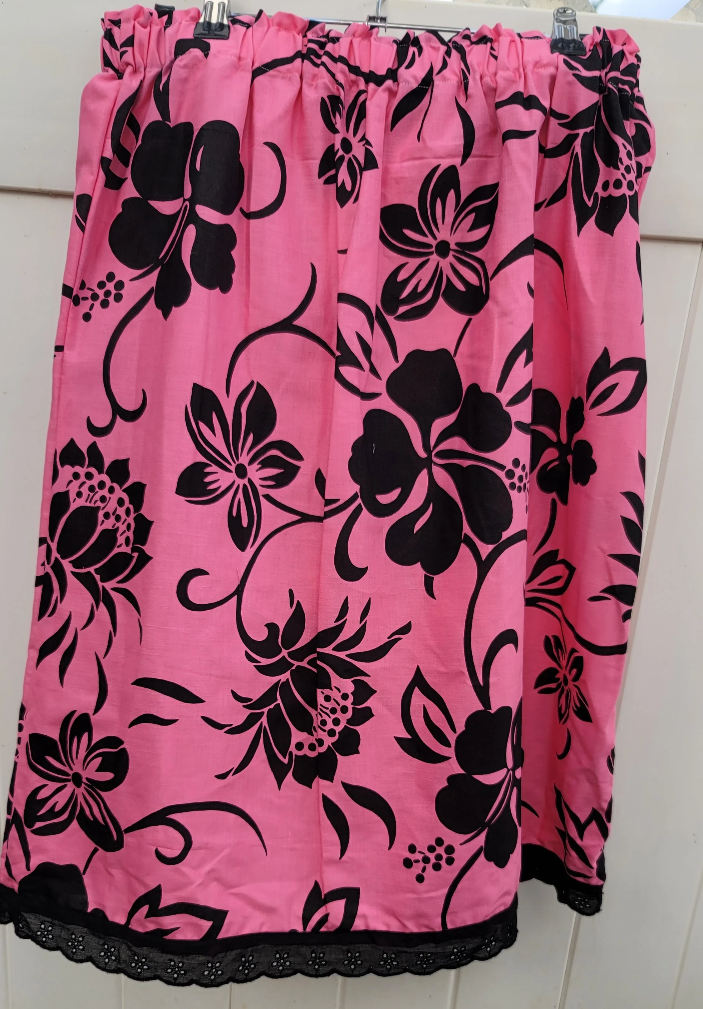 Our Lana top is sewn with a vintage red and white flower print fabric, captivating to the eye. The top features an elastic design across the top, providing a flexible fit. There is a small peek boo slit in the back for an added touch of sass. It is available in sizes small, which measures approximately 13 - 18 inches across and 17” in length, and size medium, measuring at 14 to 20” across and 17” in length. The bottom has an added touch of detail, white eyelet lace. Lightweight and cool, it can be dressed up or down.