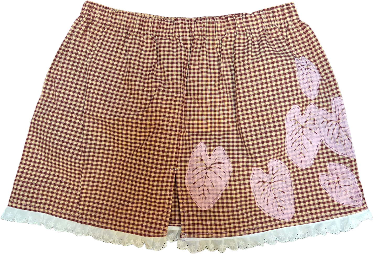 Introducing our hand-stamped Tiare Block Print Wahine U'i Top in a black and tan colored gingham fabric with white Tiare Block Print on front and back of top. All stamps are hand-carved by us to offer a distinct style. There is a peek a boo back and white Eyelet lace trim along the bottom to offer a bit of sass! Size small/medium measuring 14” - 21” across the front and 17” in length.