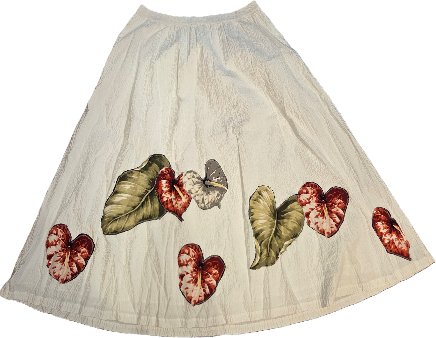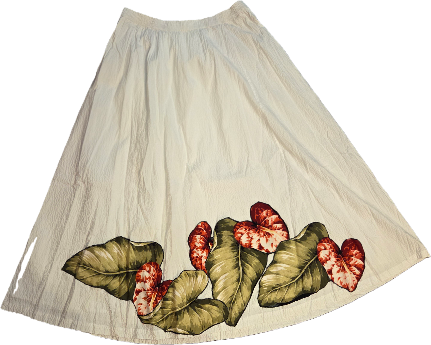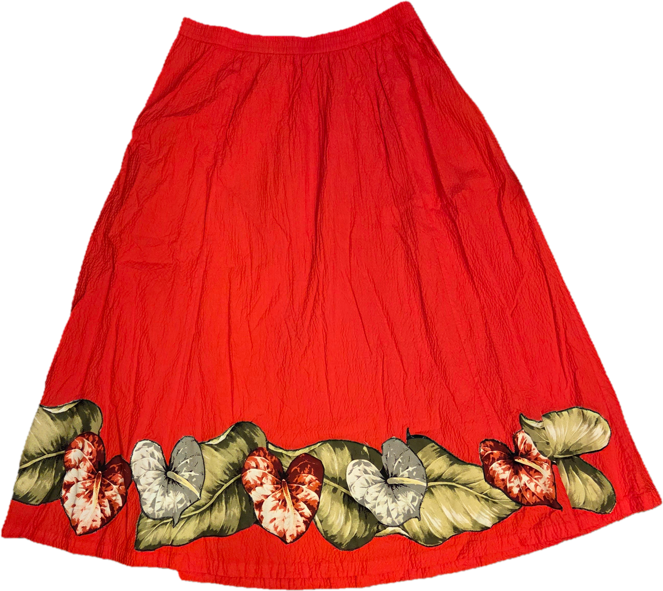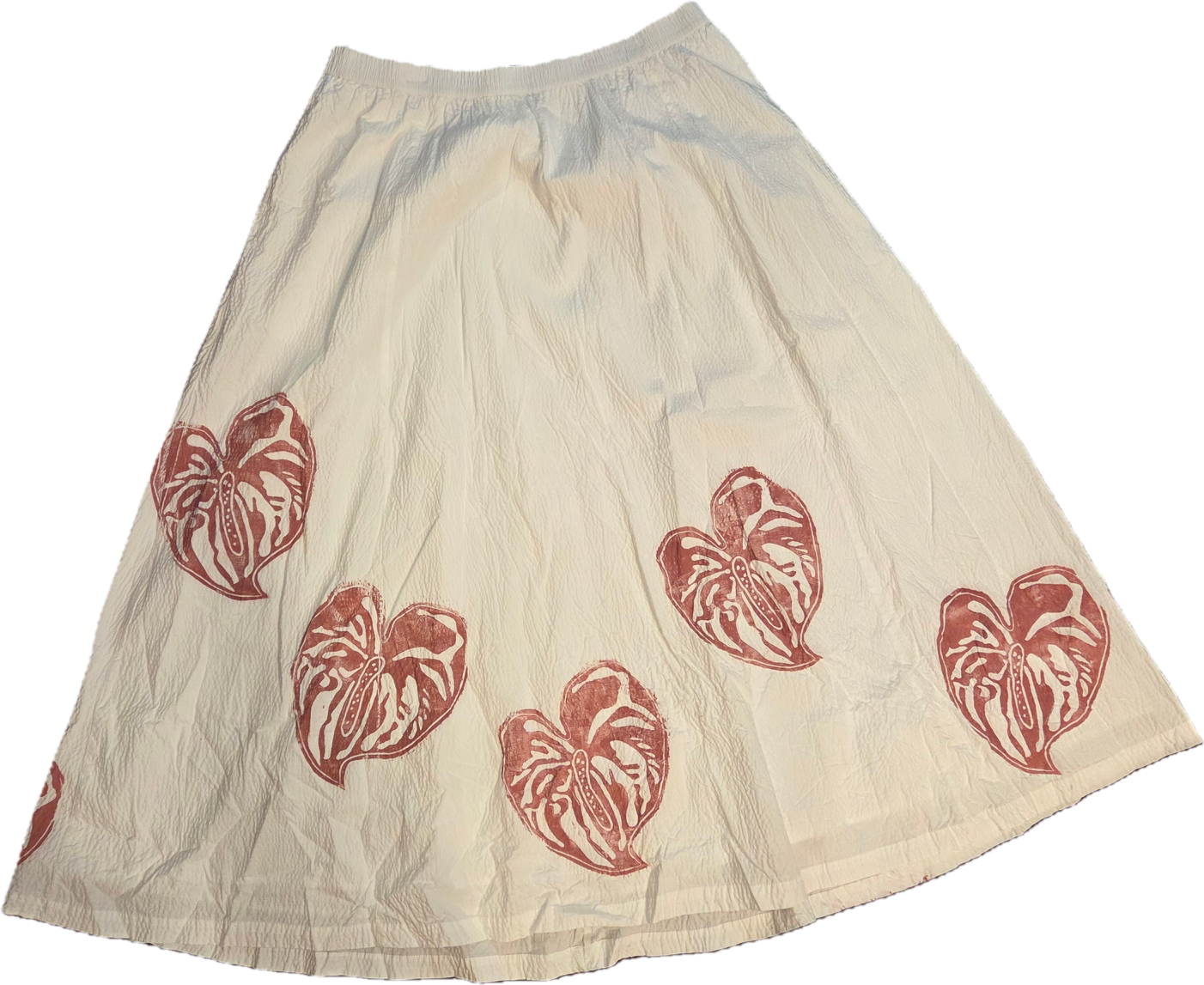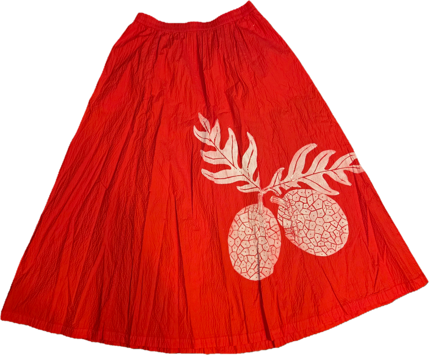 Introducing our block print Ulu Wahine Uʻi dress. She is absolutely stunning in a tomato red color with hand done white Ulu and Ulu leaf block print. She is a size medium and has an elastic top that measures at approximately 15 1/2” to 22 1/2” across the front and 39” in length.