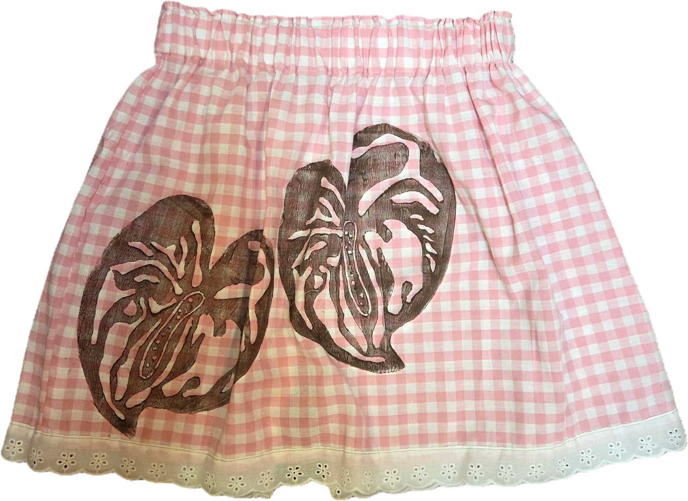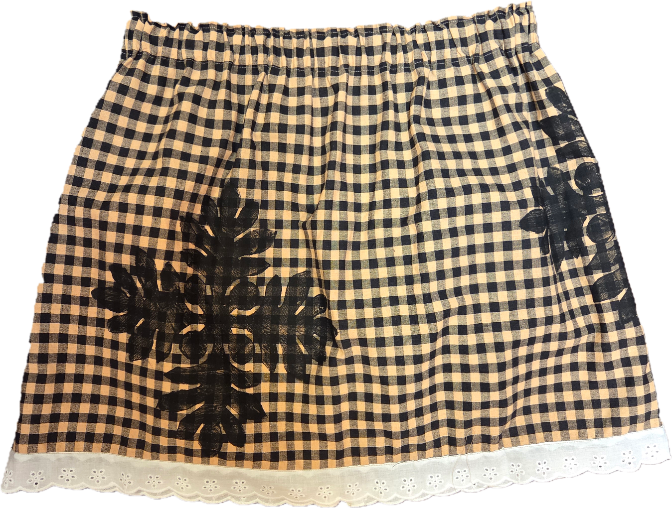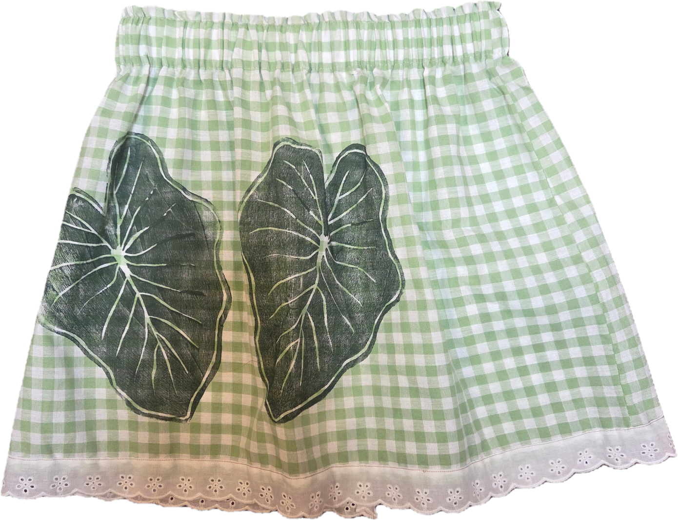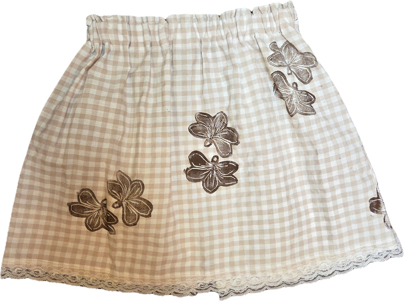 Wahine U’i Gingham Top sewn using a taupe and white colored gingham fabric with a Naupaka block print. There is white eyelet lace trim along the bottom edge and a peek a boo back for a bit of sass. The top is a size medium -large and measures at approximately 15 to 22” across the front with an elastic band. Please take note of sizing as all sales are final.