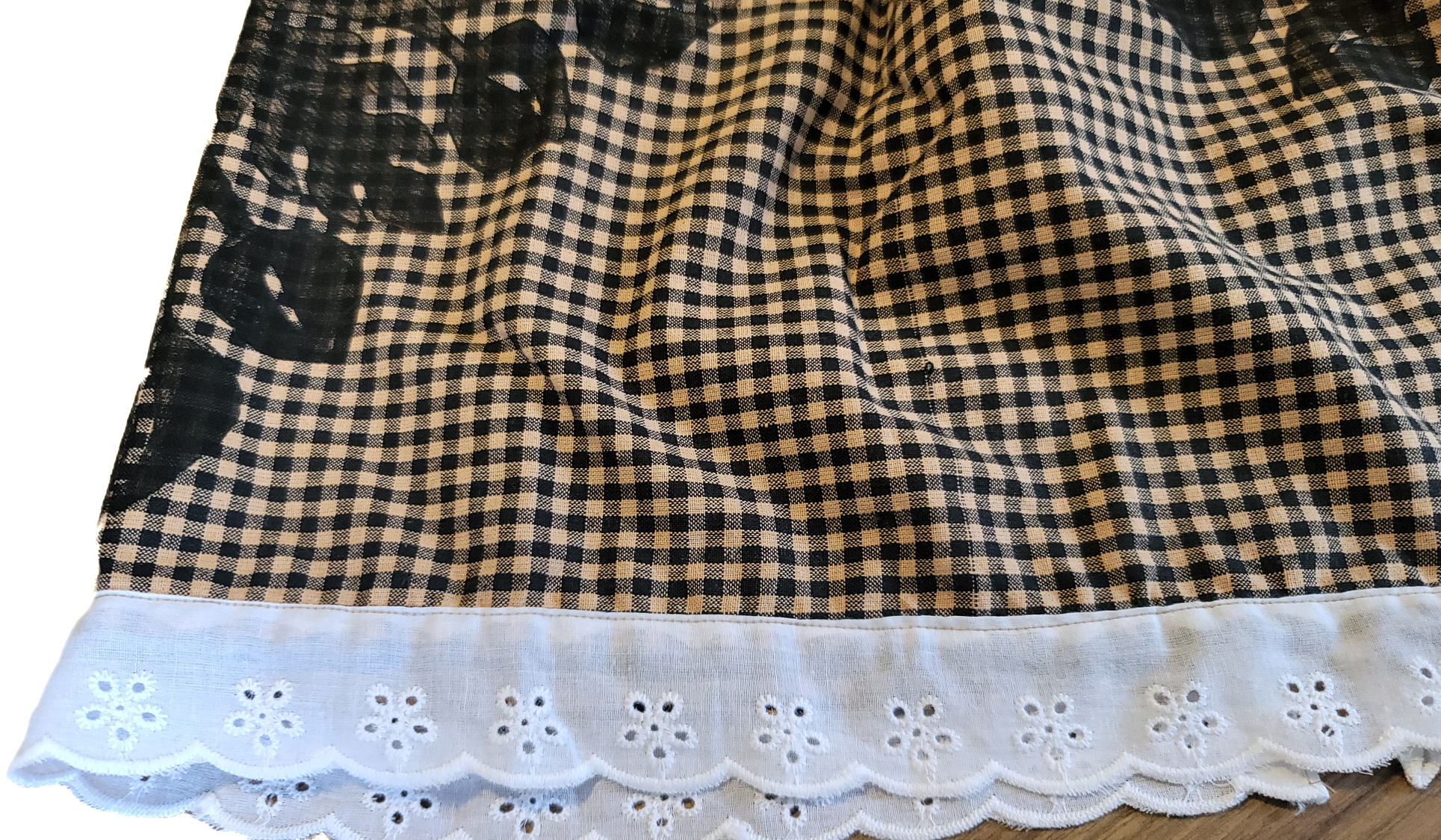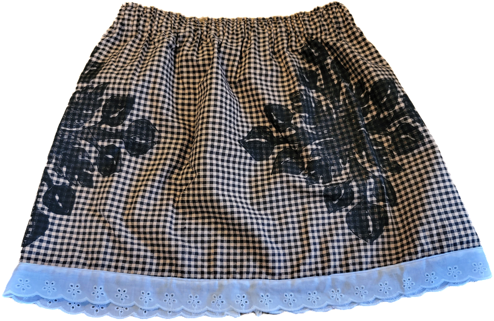 Wahine U’i Top in a taupe and cream colored gingham fabric with an Anthurium 13 - 21” across the front and 16 -17” in length. There is a peek a boo back for an added touch of sass and a white eyelet lace trim along the bottom hem.