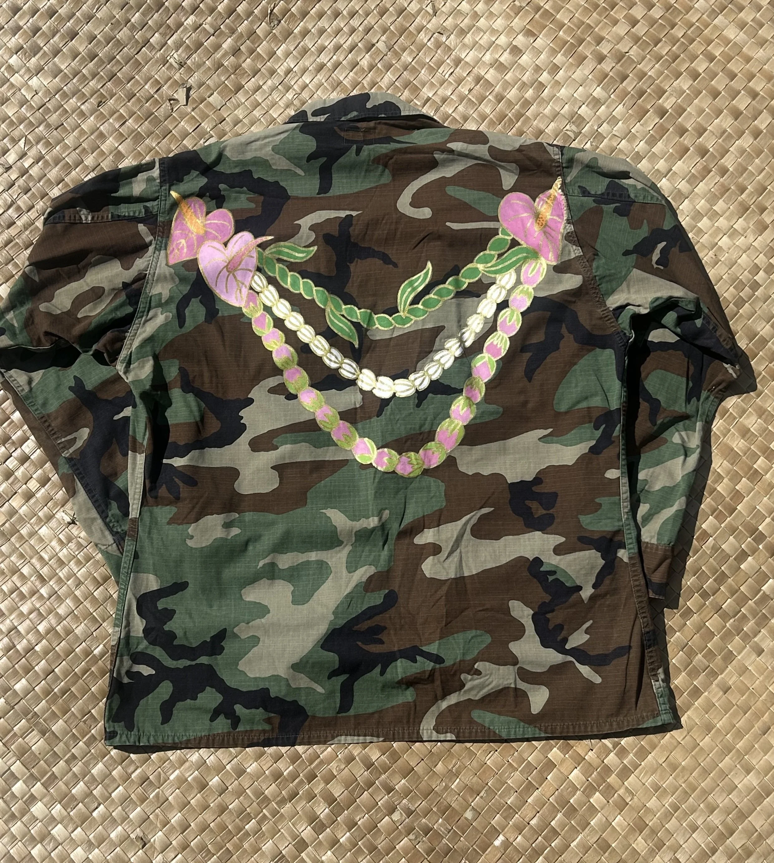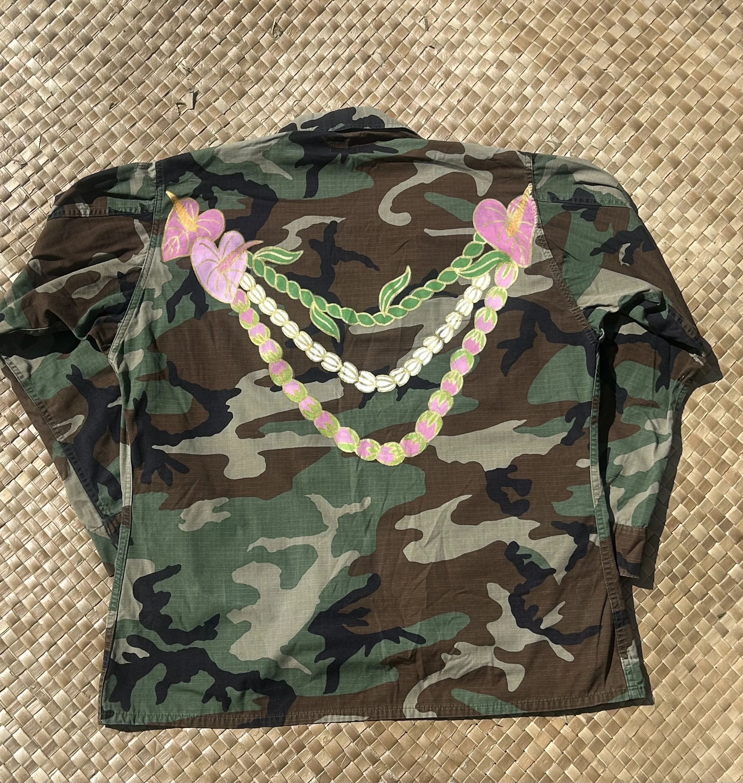 Refashioned camouflage jacket with three handpainted leis across the back. Leis consists of Lei Lāʻi (ti leaf) Pikake, and Lokelani (Rose), as well as three Anthuriums at the tops of the lei. The jacket is a darker green. color and is a size Large long. Approximate measurements are PTP 26 “ across and 33” in length.