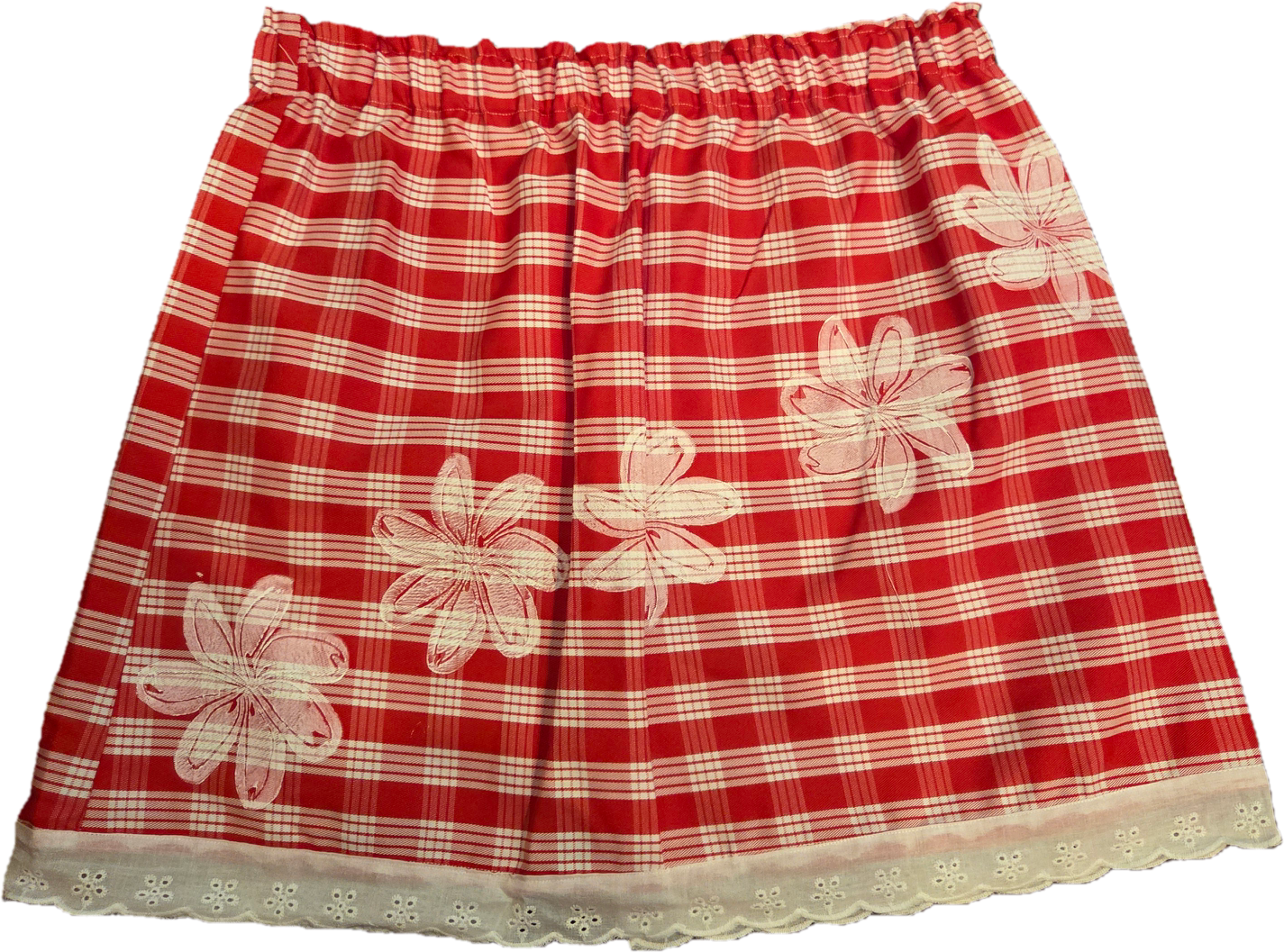Introducing our block print Tiare Wahine Uʻi top. She is absolutely stunning, red palaka print with hand-done white Tiare block print. Each stamp is hand-carved by us displaying a distinct style. She is a size small - medium and has an elastic top that measures at approximately 15” to 20” across the front and 17” in length. There is a peek a boo back and a white eyelet lace trim.