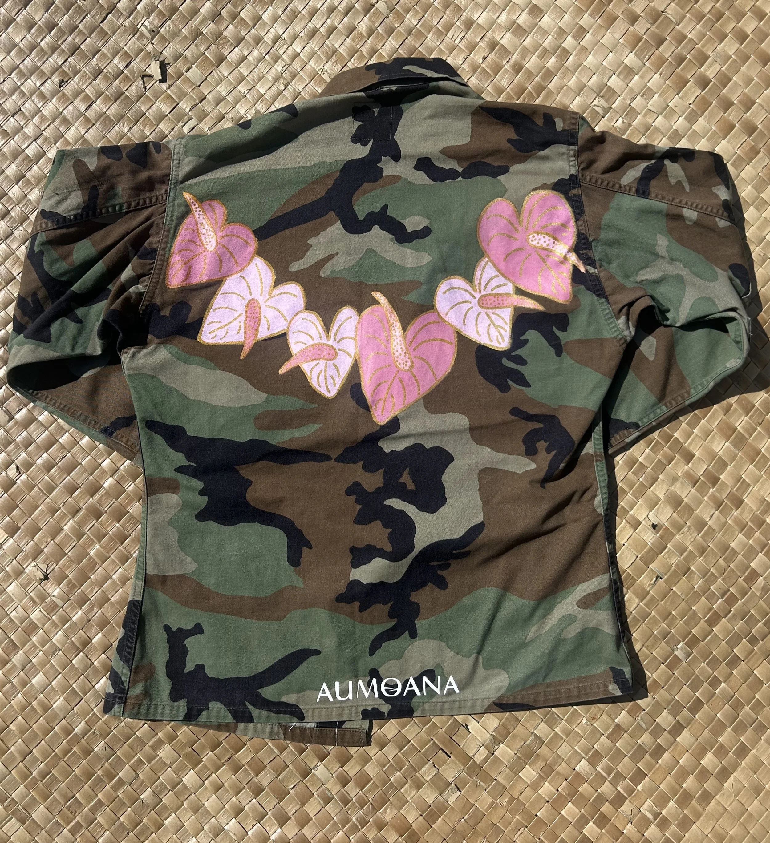 Refashioned camouflage jacket designed with pink Anthurium painted across the back. The jacket is a size medium short and measures at approximately 21” across PTP and 29” in length.