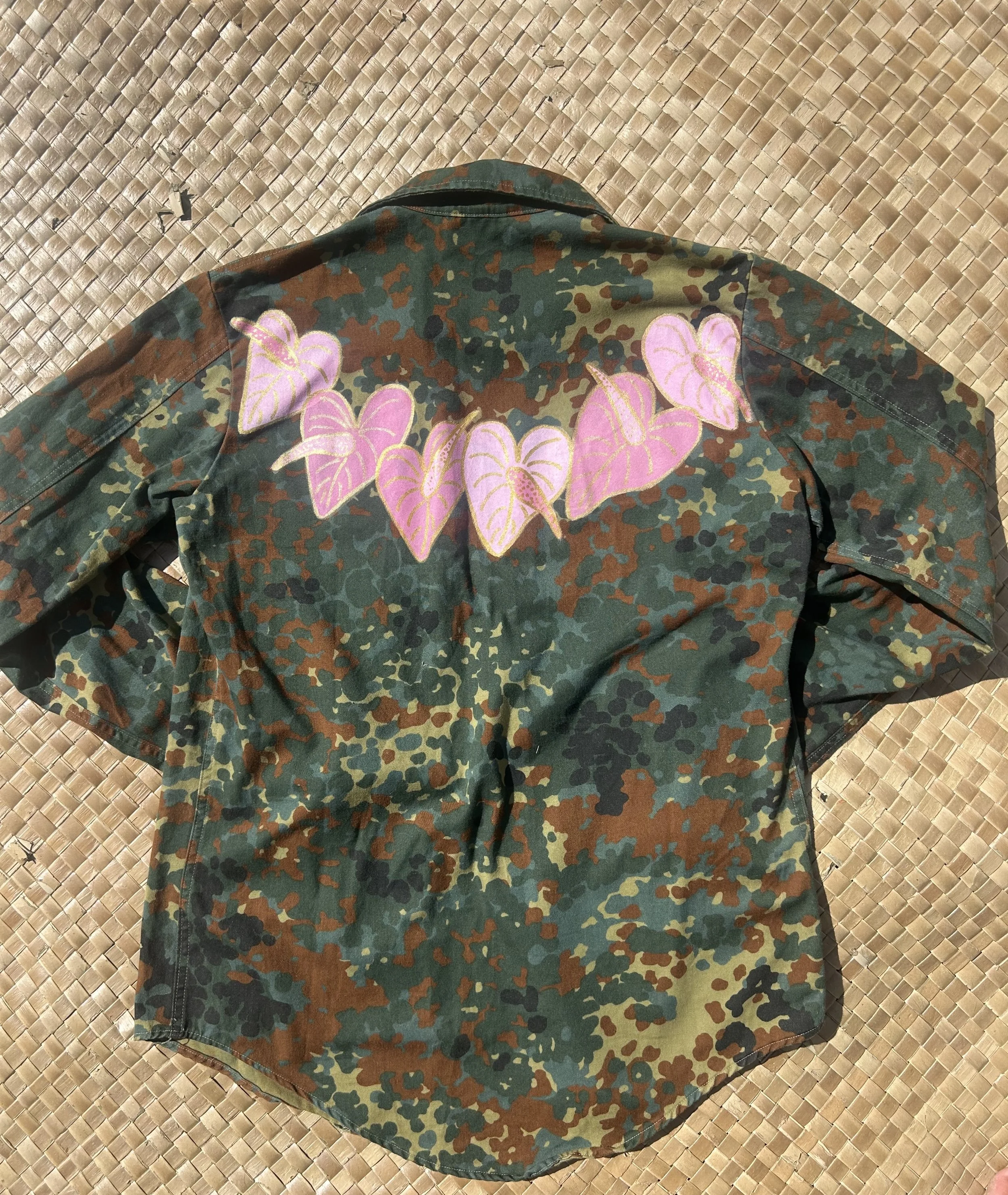 Refashioned camouflage jacket with handpainted Anthurium flowers across the back. The jacket is a size medium and measures at approximately PTP 22”across and 34” in length.