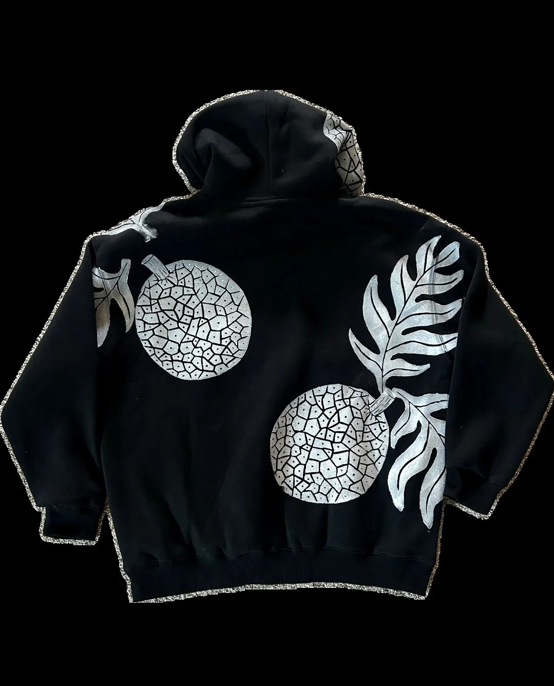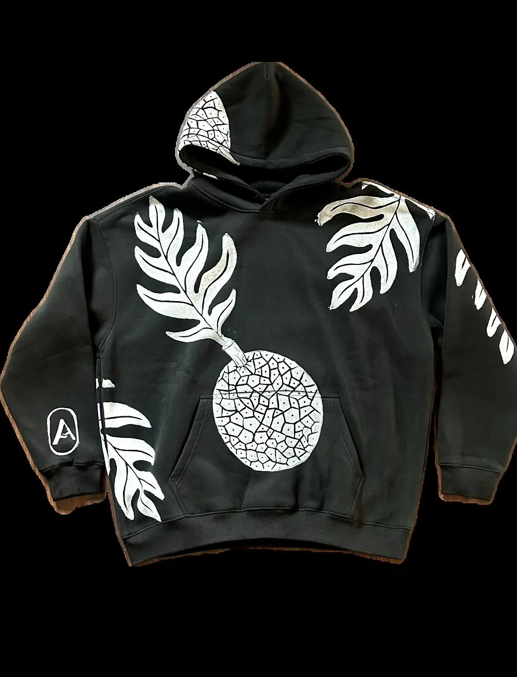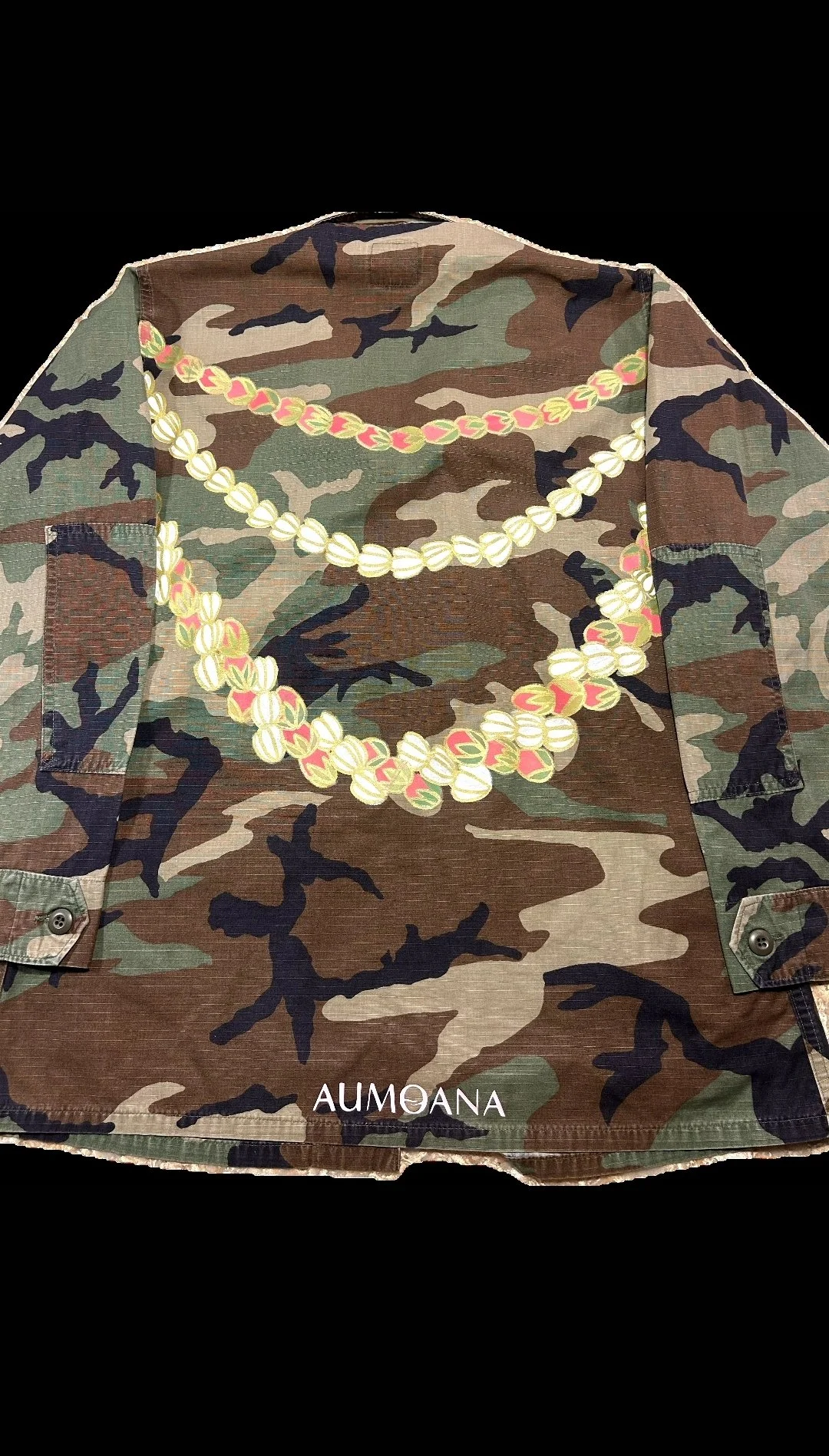 Vintage camouflage jacket, size medium long. Backside of jacket has been hand-painted to display three lei. Lei Lokelani, Pikake, and a double Pikake and Lokelani twist.