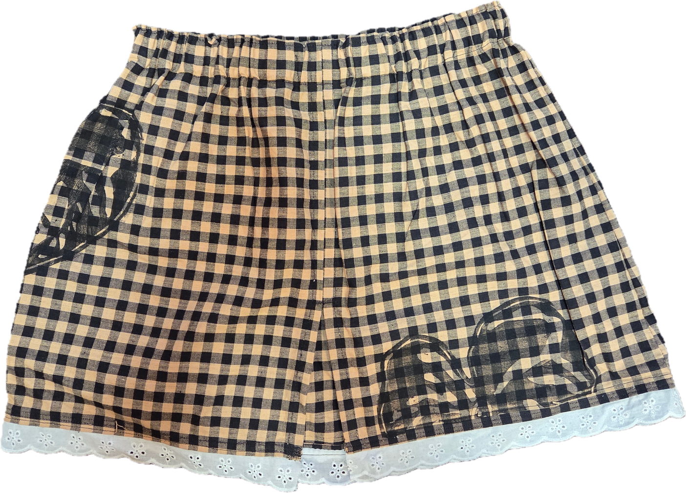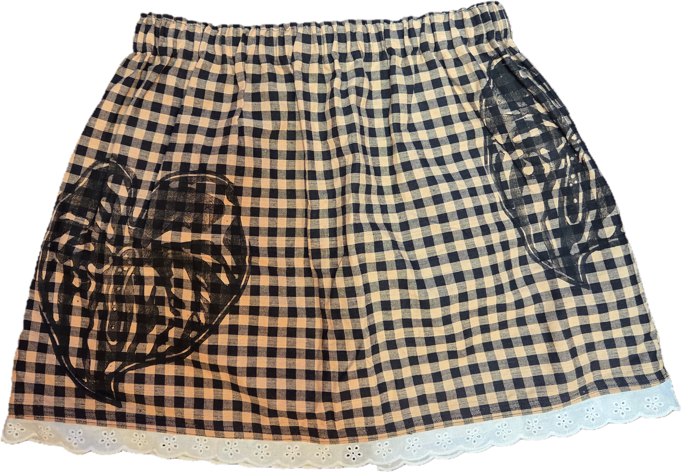 Introducing our hand-stamped Anthurium Block Print Wahine U'i Top. Designed using a black and tan gingham fabric and handstamped Anthurium in black on front side and back. All stamps are hand-carved by us to offer a distinct style. This top is a size extra small - small measures at approximately 13” - 20” across the front and 16” in length.