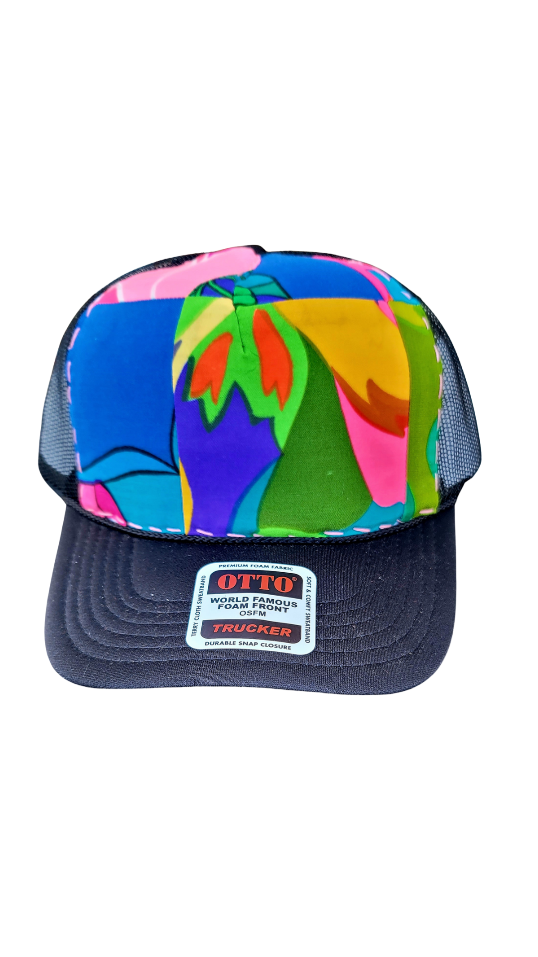 Hand stitched trucker Otto hat black in color using a vintage patchwork fabric with an assorted bright colored print. The hat is adjustable in size.