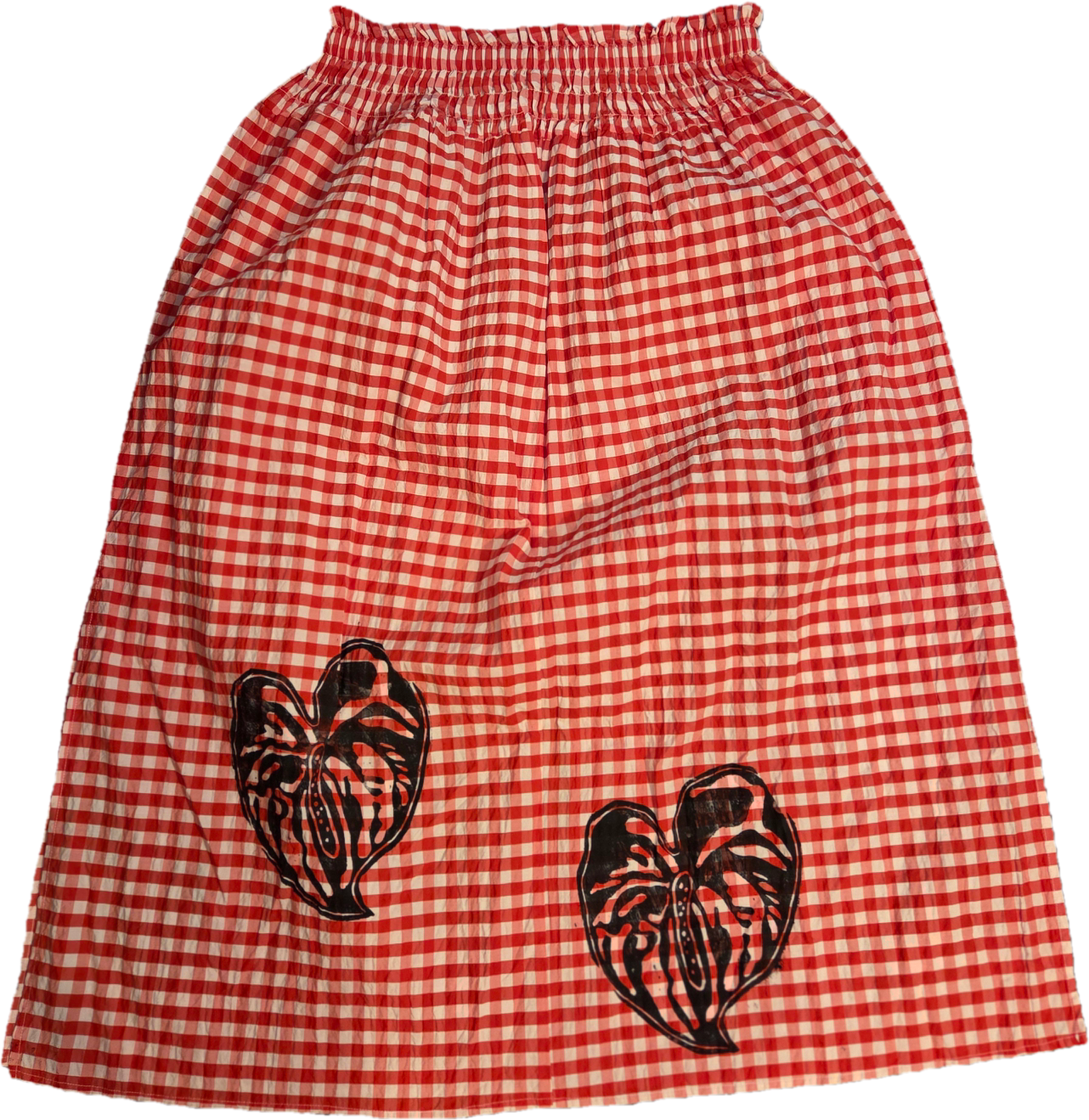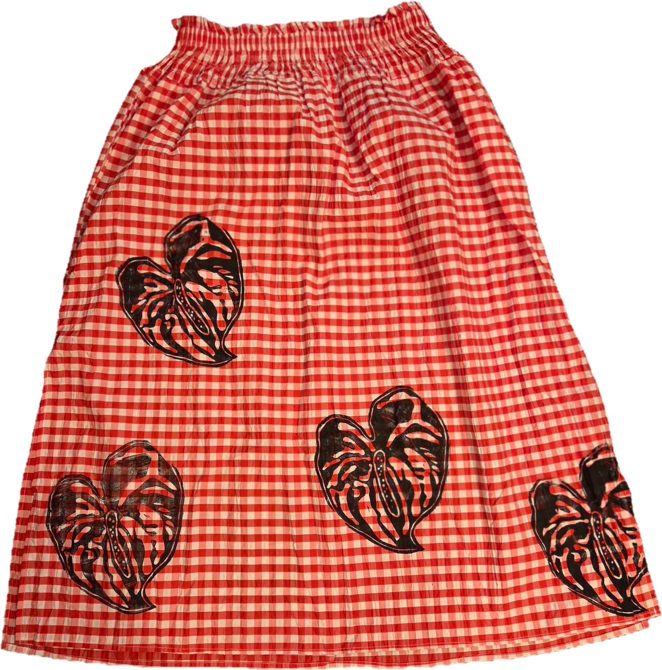 Wahine Uʻi dress is white in color with an inner lining. Pink Hibiscus flowers are appliqued all over the dress. The dress is a size large and has an elastic top which measures at approximately 18” to 25” across the front and 39” in length.