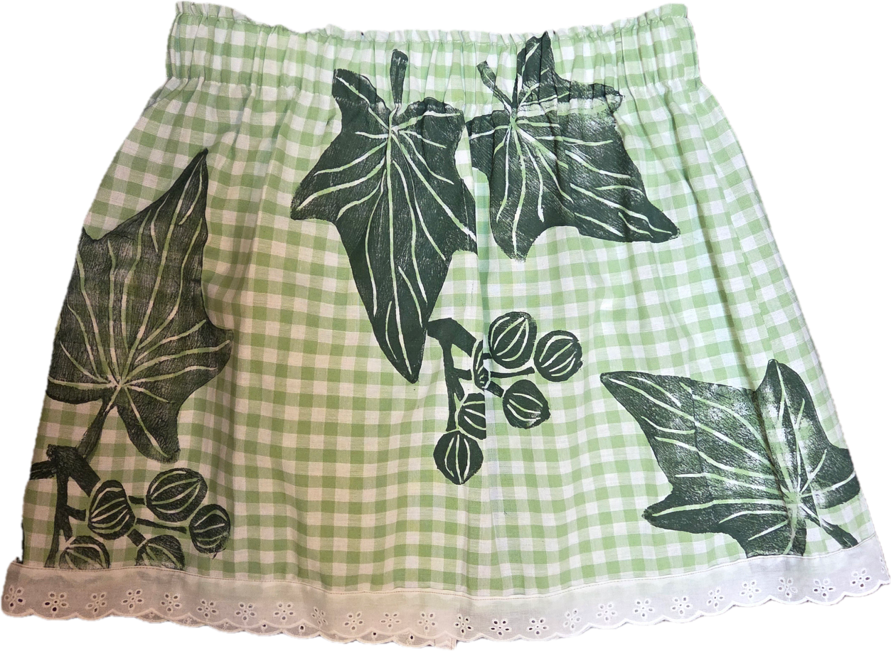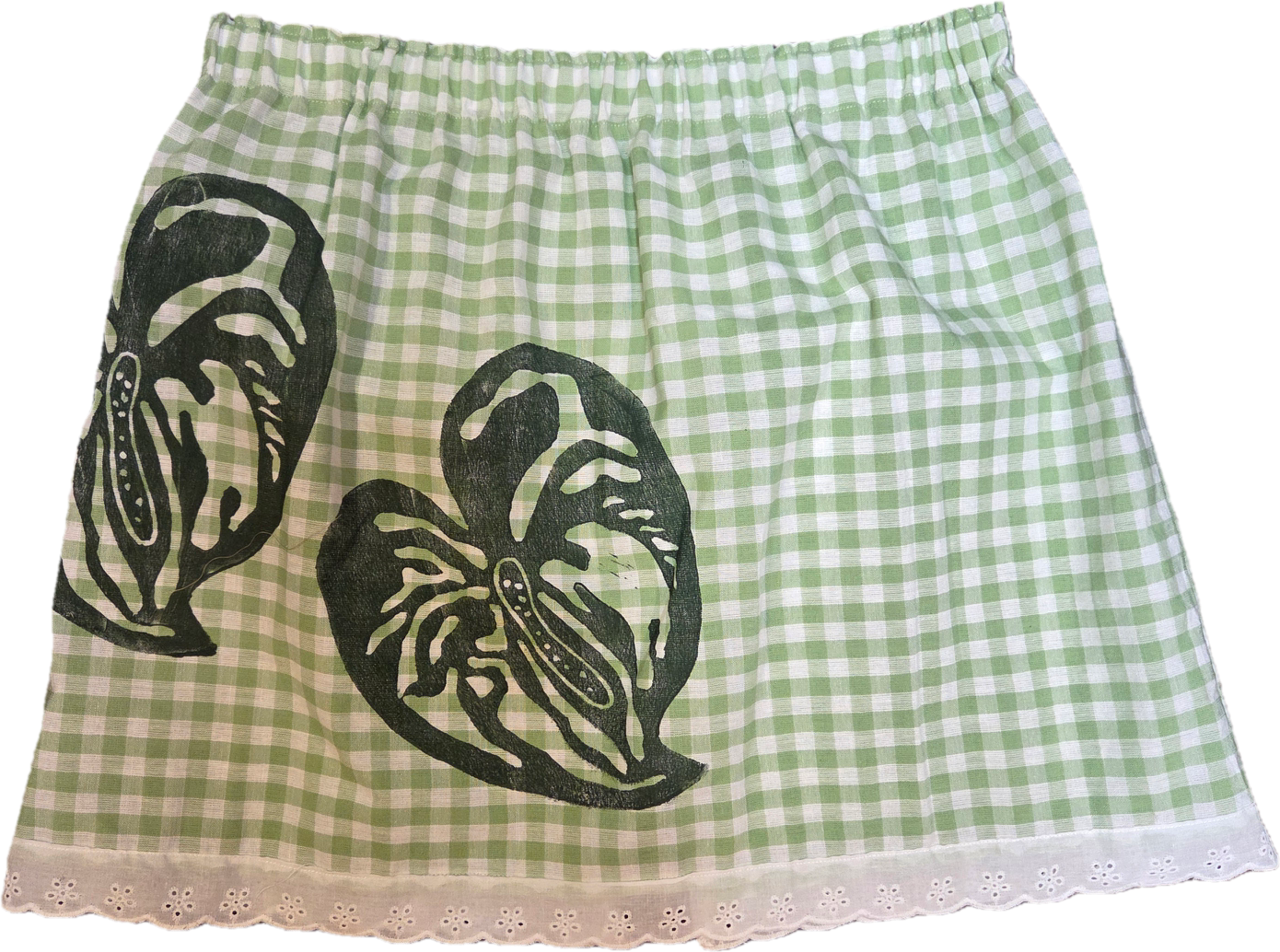 Wahine U’i Gingham Top sewn using a mint green colored gingham fabric with Anthurium block print. There is white eyelet lace trim along the bottom edge and a peek a boo back for a bit of sass. The top is a size large - extra large and measures at approximately 16 to 22” across the front with an elastic band. Please take note of sizing as all sales are final.
