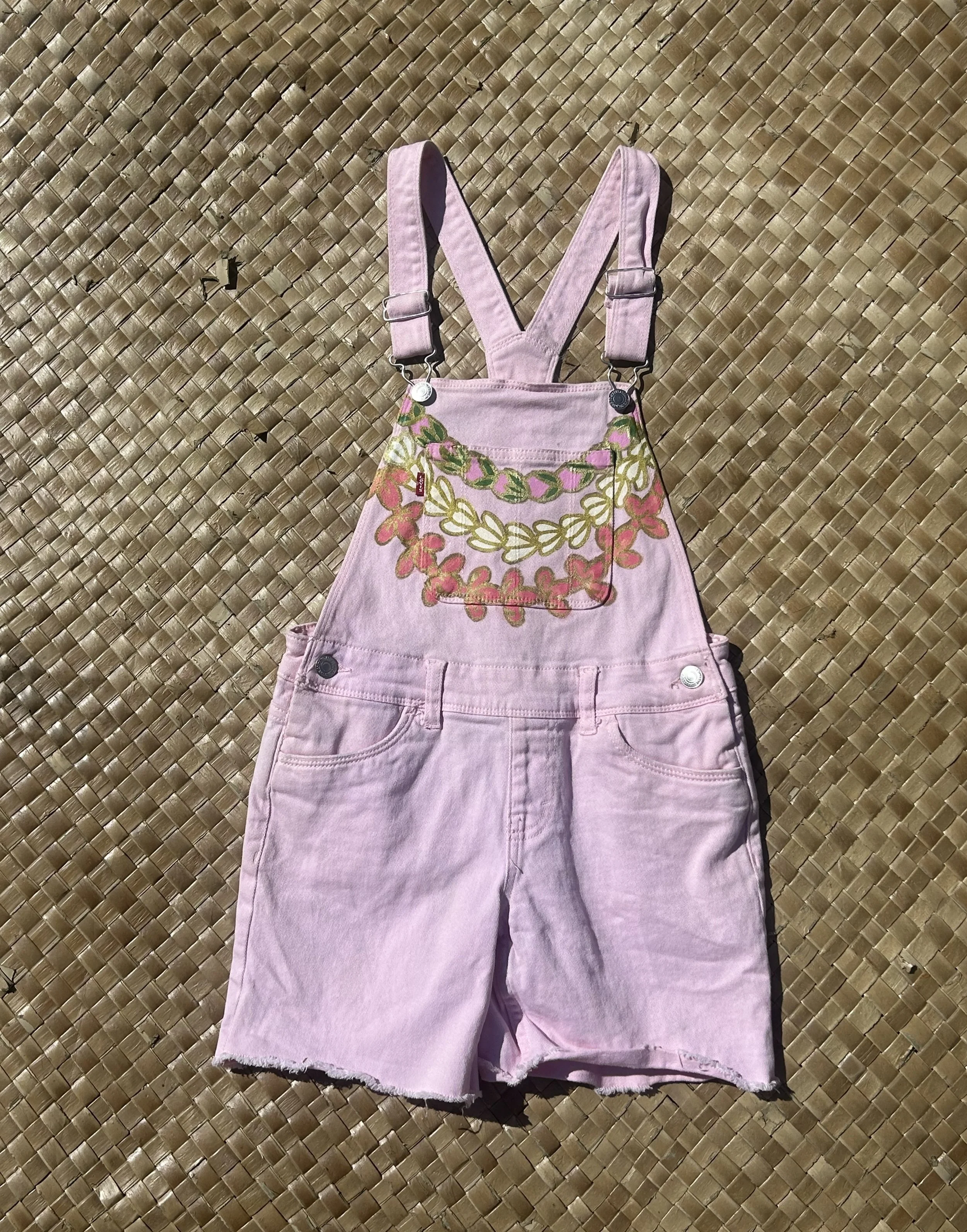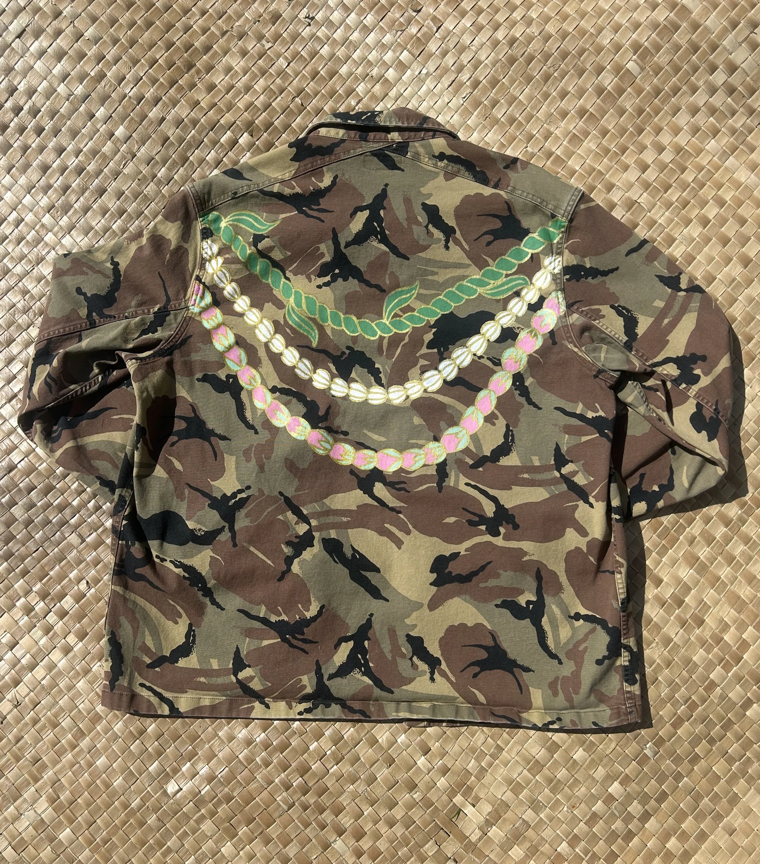 Refashioned camouflage jacket. Handpainted with three lei across the back , Lei Lāʻi, Pikake, and Pink Lokelani. The jacket is. size extra large and measures at approximately 25” across PTP and 31 1/2” in length.