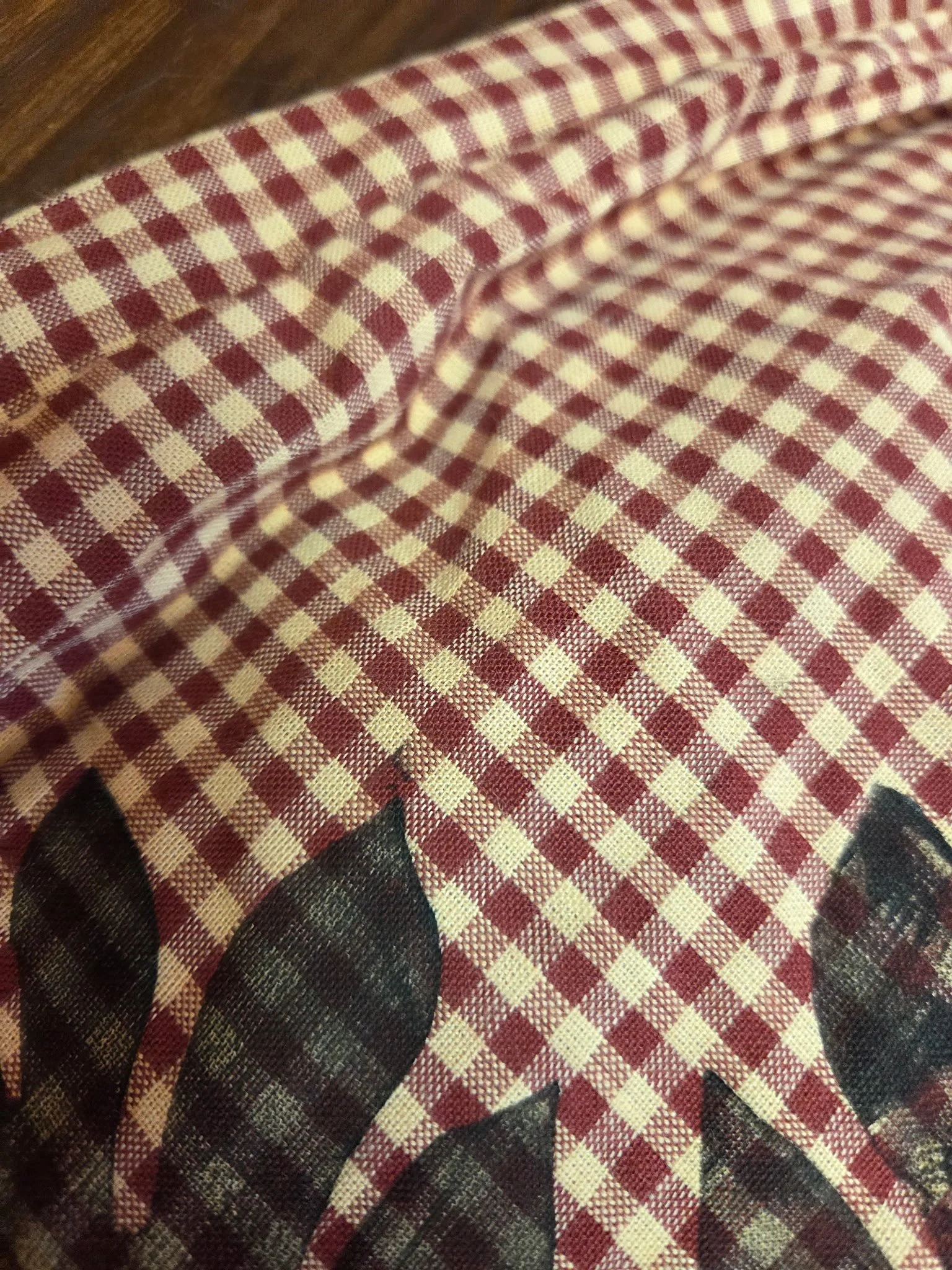 Introducing our hand-stamped Kapa Kuiki block print Wahine U'i Top. Designed using a wine and tan colored gingham fabric and handstamped Kapa Kuiki in black on front and back of top. All stamps are hand-carved by us to offer a distinct style. The top has an elastic band. This is a size xl measuring at approximately 17” - 27” across the front and 19” in length. There is a peek a boo back and white Eyelet lace trim along the bottom hem to add a but of sass!