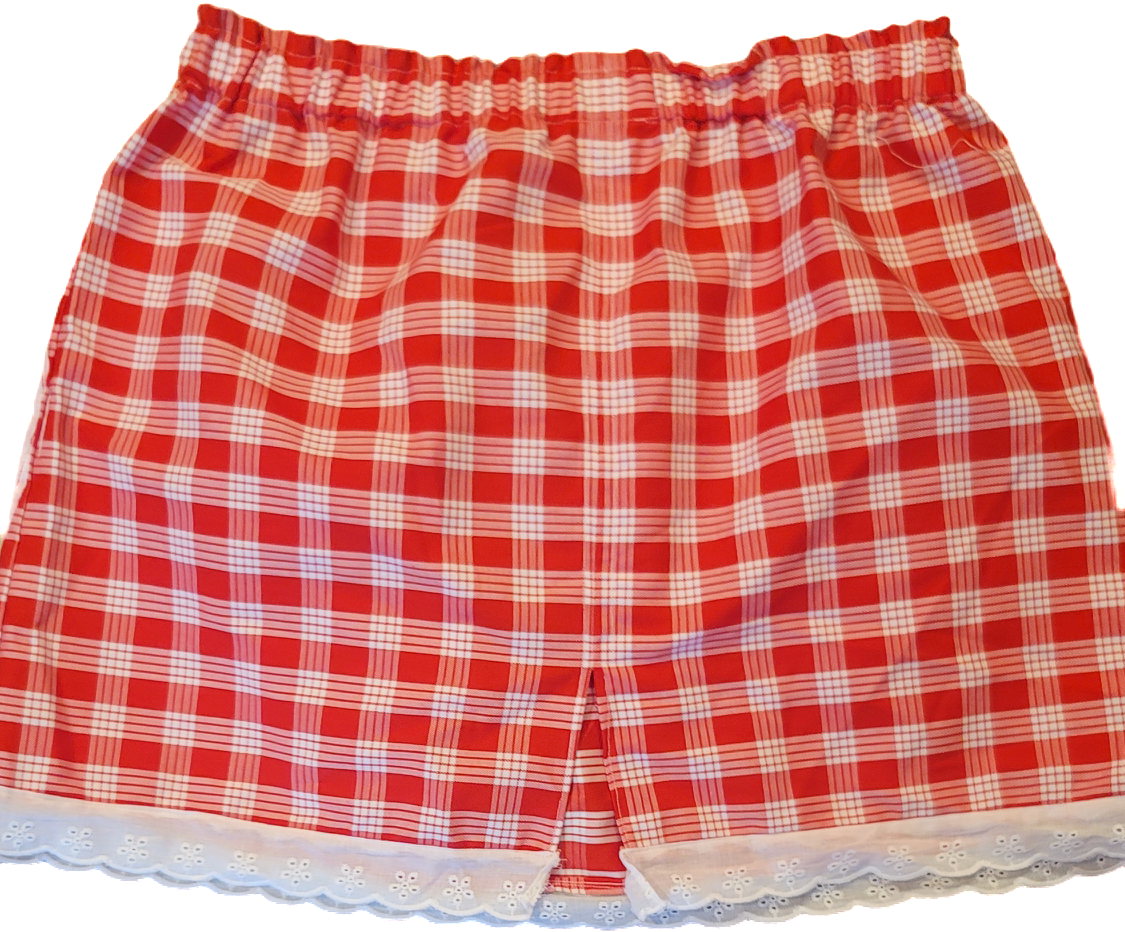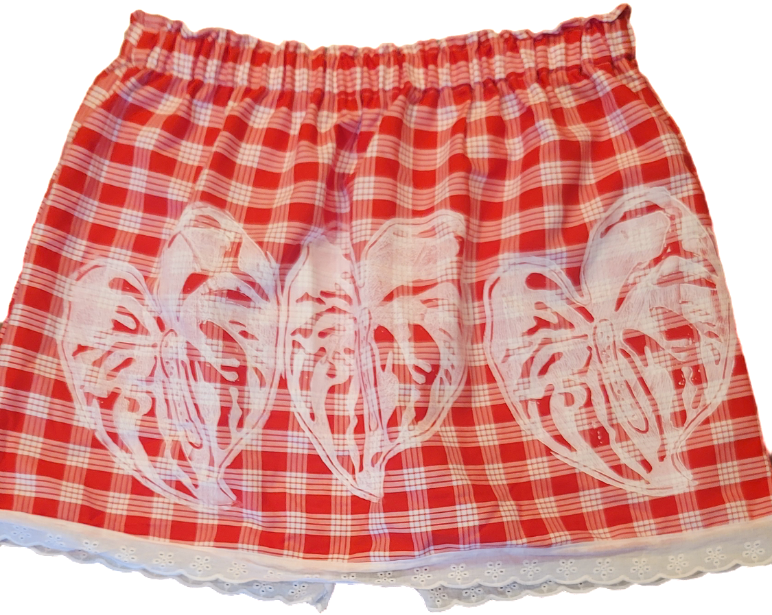 Introducing our block print Kapa Kuiki Wahine Uʻi top. She is absolutely stunning, red palaka print with hand-done black Kapa kuiki block print. Each stamp is hand-carved by us displaying a distinct style. She is a size extra small - small and has an elastic top that measures at approximately 13 1/2” to 19” across the front and 17” in length. There is a peek a boo back and a white eyelet lace trim.