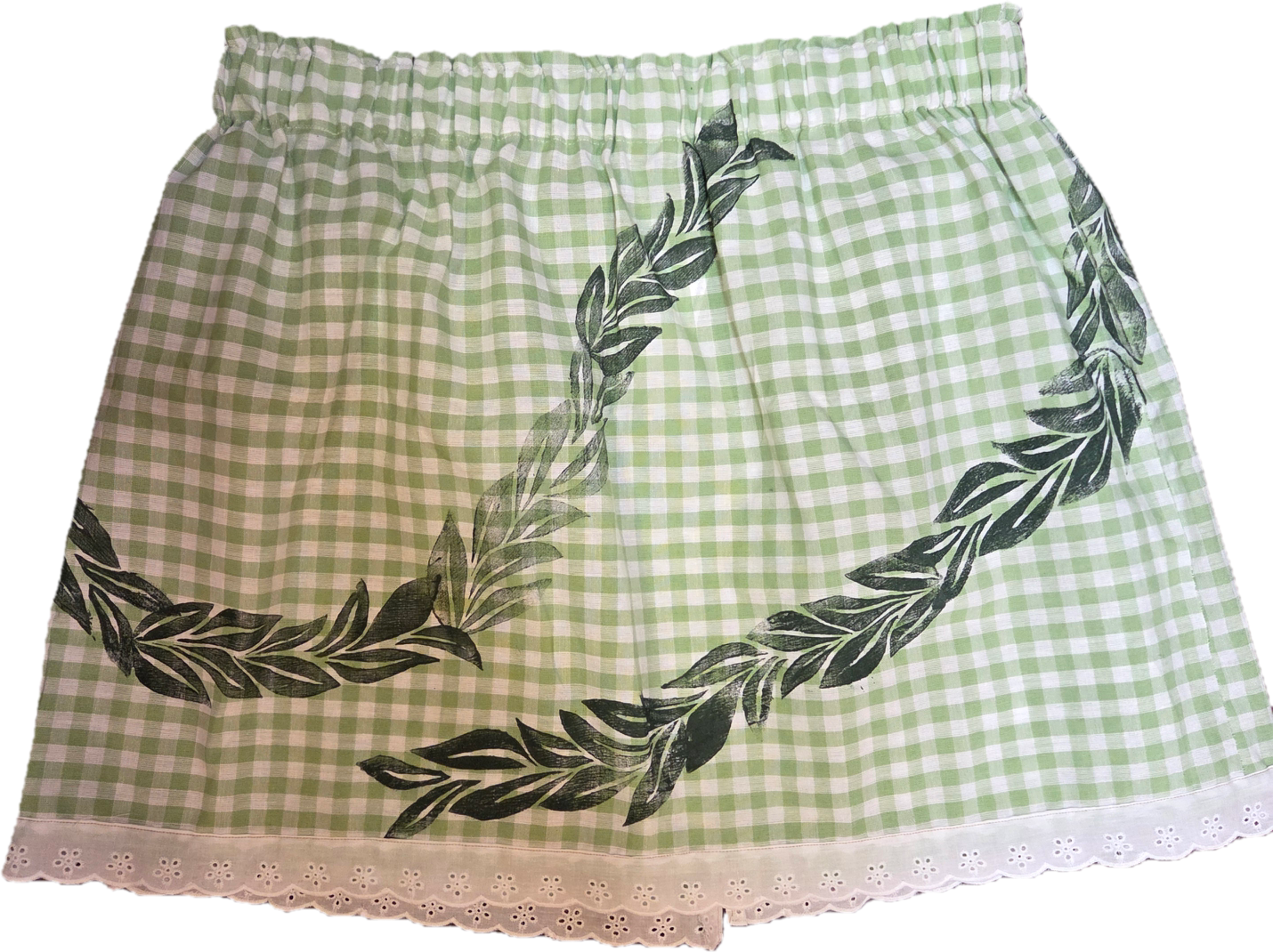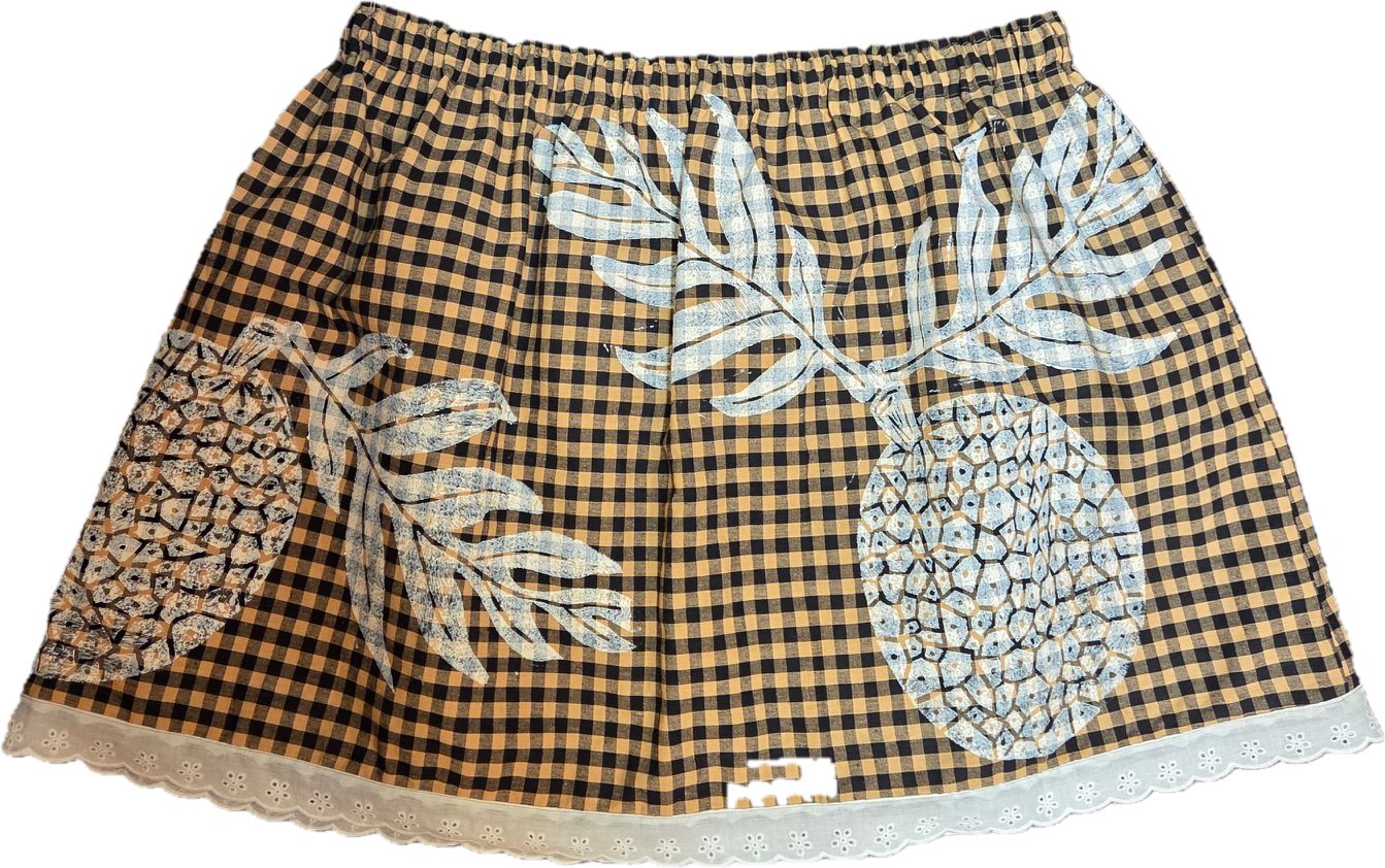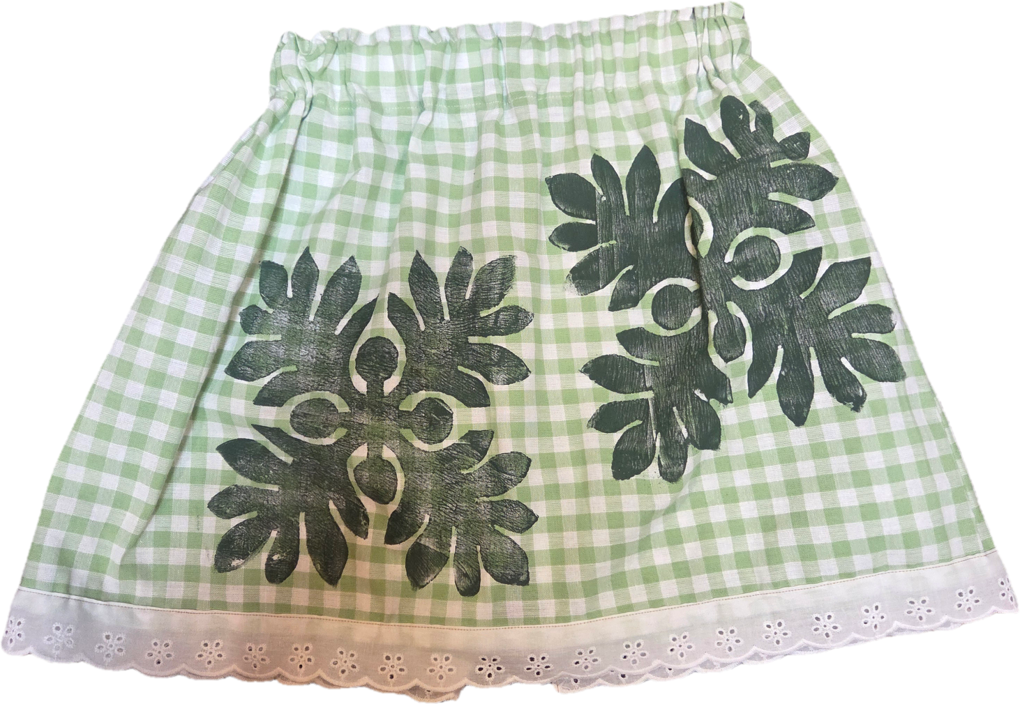 Wahine U’i Gingham Top sewn using a Mint green colored gingham fabric with Maile Lei block print. There is white eyelet lace trim along the bottom edge and a peek a boo back for a bit of sass. The top is a size xxl and measures at approximately 18 to 26” across the front with an elastic band. Please take note of sizing as all sales are final.