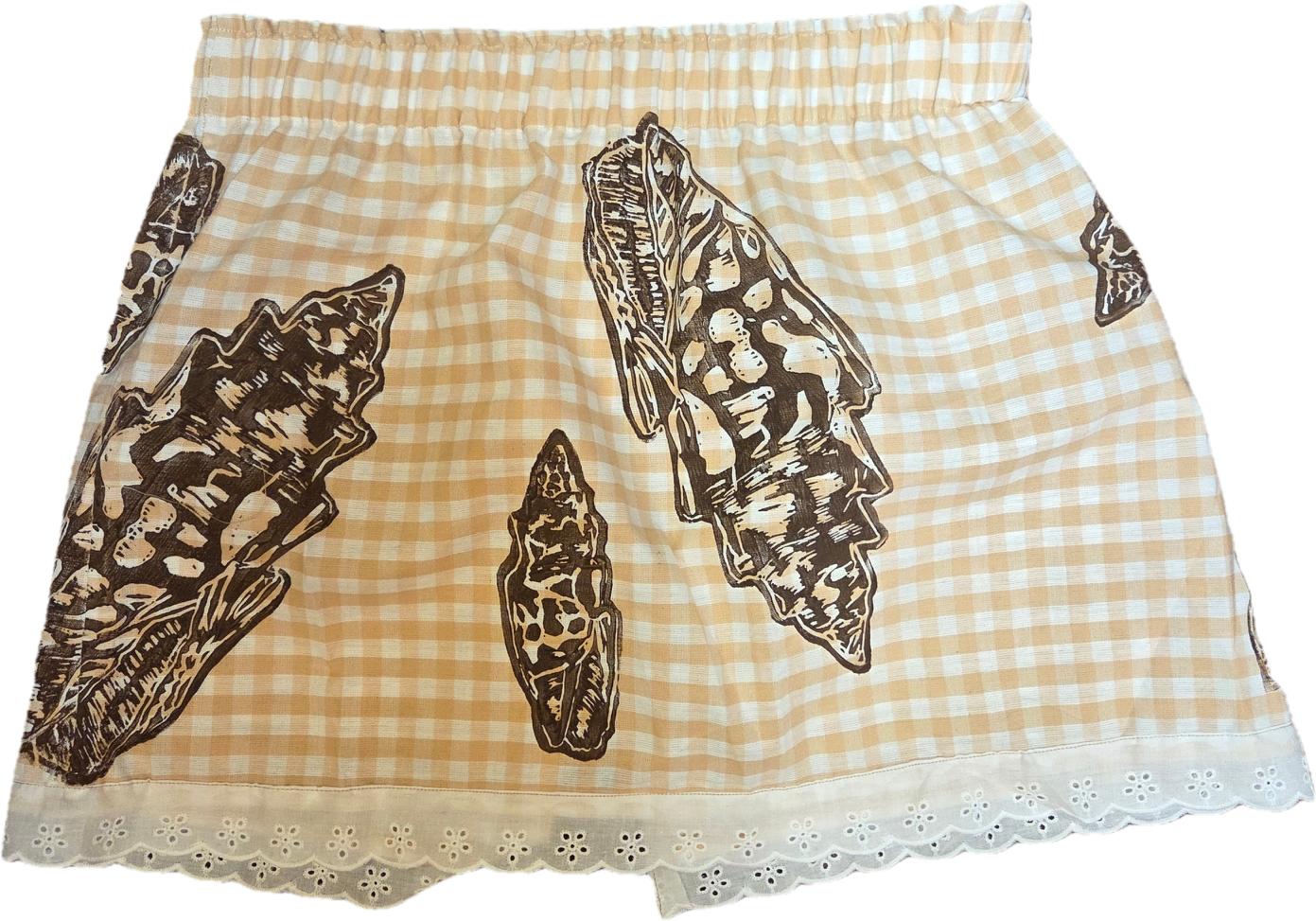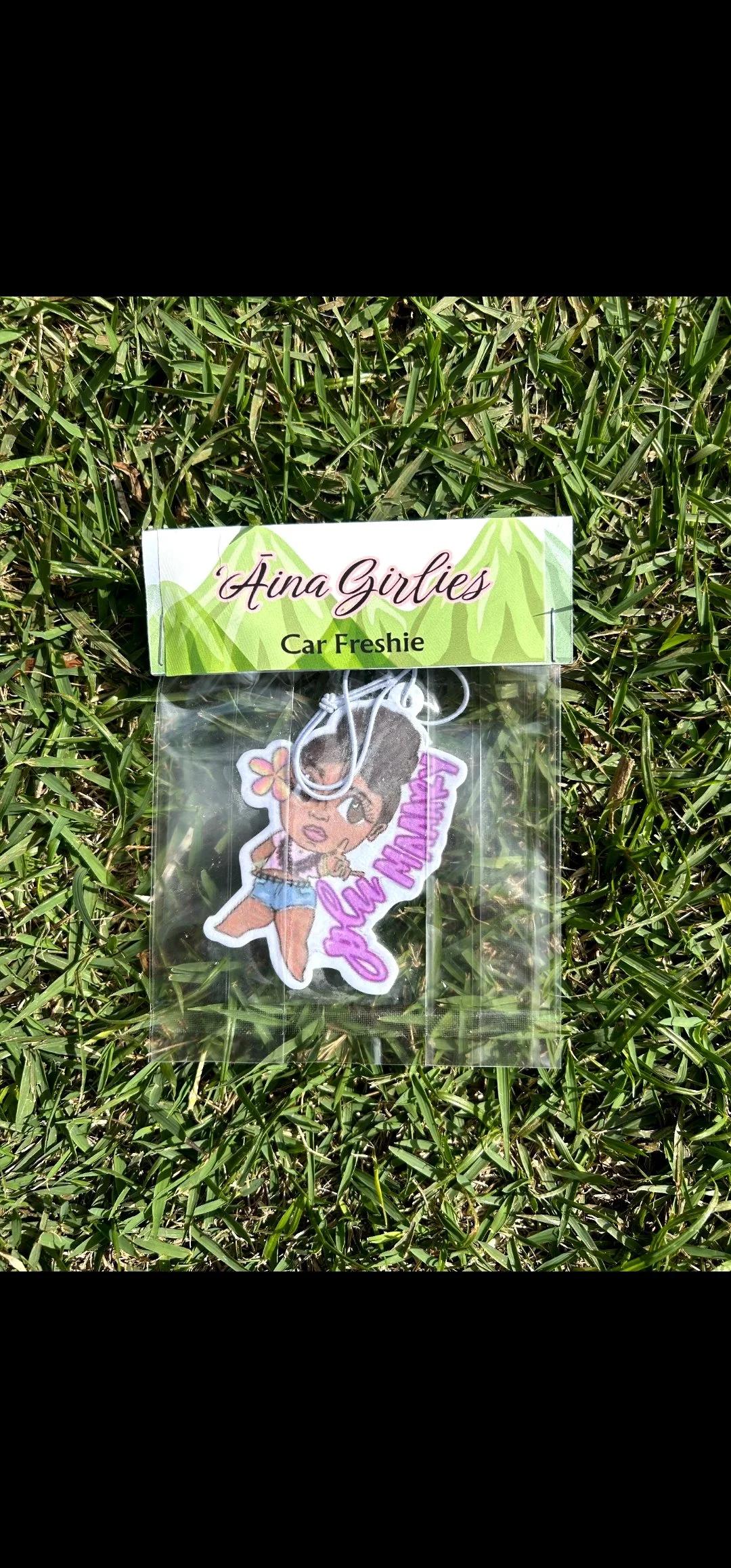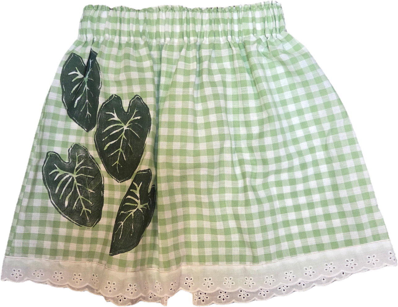 Wahine U’i Gingham Top sewn using a Mint green colored gingham fabric with Maile Lei block print. There is white eyelet lace trim along the bottom edge and a peek a boo back for a bit of sass. The top is a size xxl and measures at approximately 18 to 26” across the front with an elastic band. Please take note of sizing as all sales are final.
