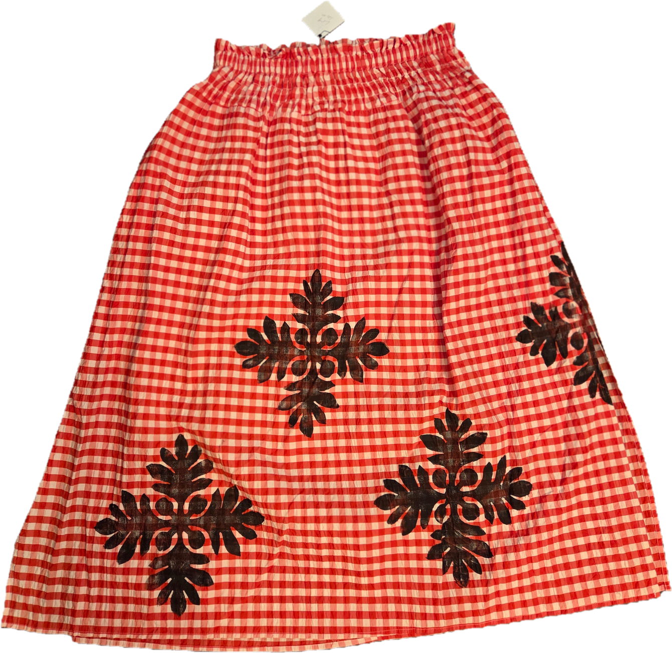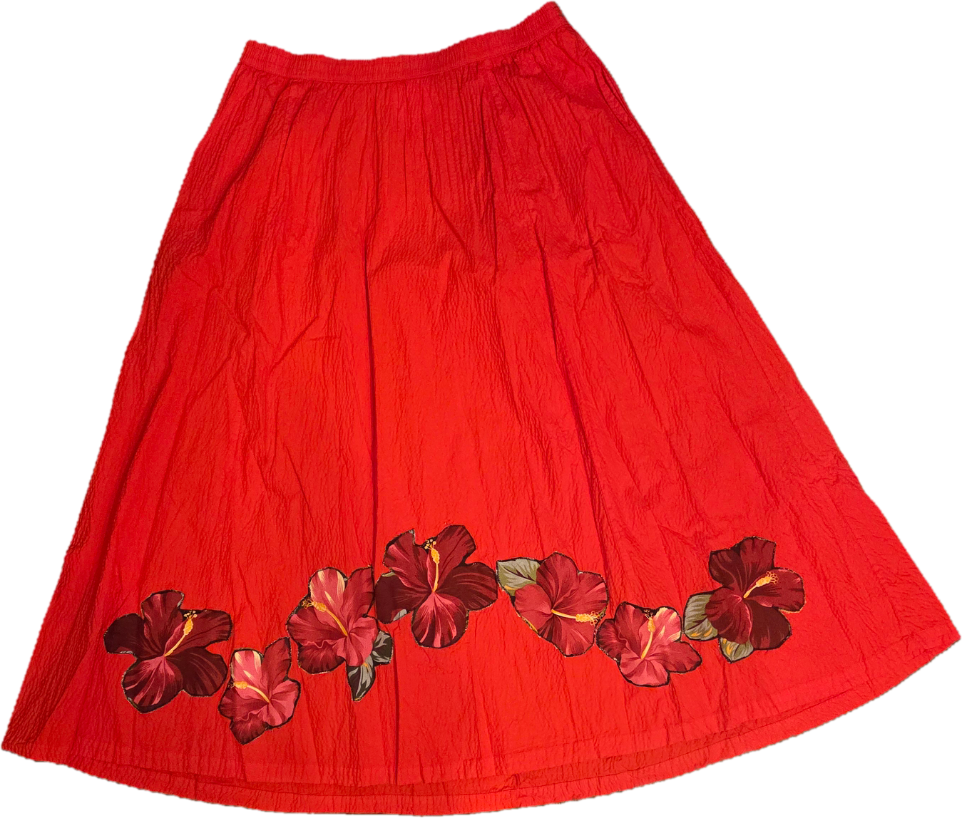 Wahine Uʻi dress is white in color and has an inside lining. Red and Grey Anthuriums are appliqued to the front of the dress. The dress is a size extra large and has an elastic top it measures at approximately 18 1/2” to 26” across the front and 39” in length.