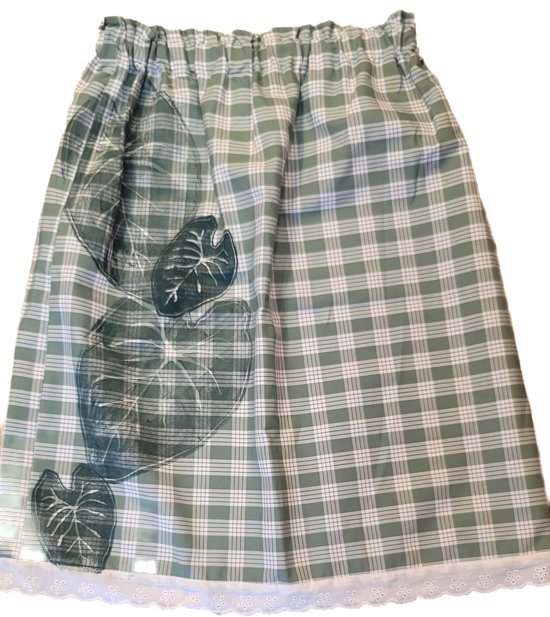 Wahine Uʻi Dress/skirt in a beautiful tomato red color perfect for the holidays. The bottom of the dress has red 7 grey Anthuriums, and green leaves that have been done in an applique style. The dress is a size xxl and measures at approximately 19” to 26 1/2” across the front and 39”in length.