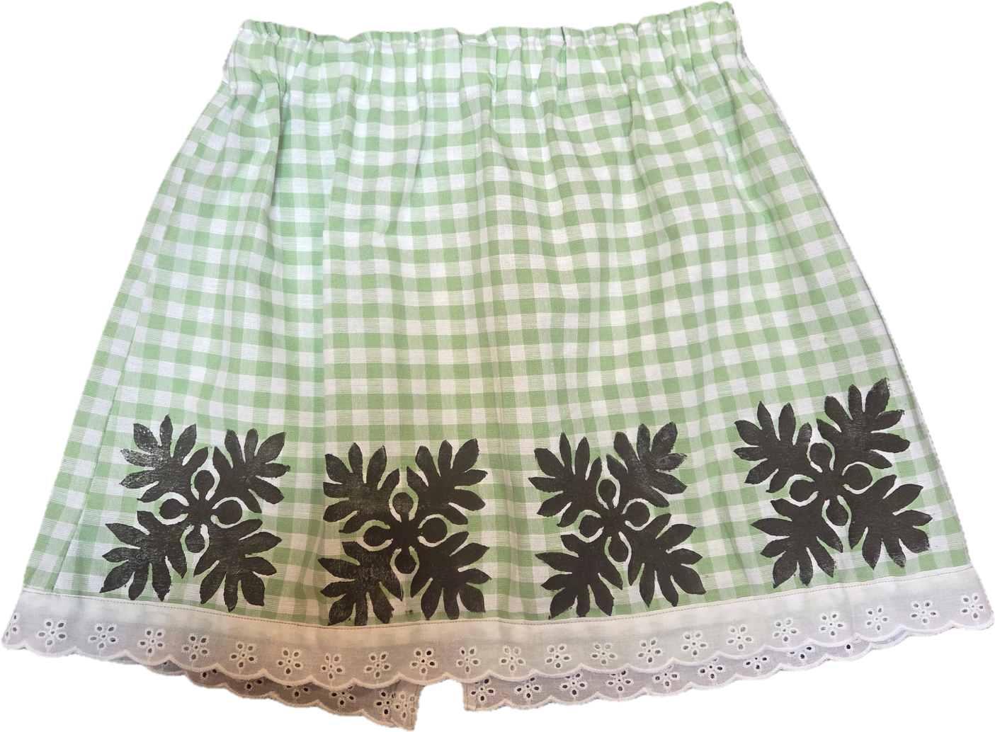 Wahine U’i Gingham Top sewn using a mint green and white colored gingham fabric with a Kuiki block print. There is white eyelet lace trim along the bottom edge and a peek a boo back for a bit of sass. The top is a size extra small - small and measures at approximately 12 to 19” across the front with an elastic band. Please take note of sizing as all sales are final.