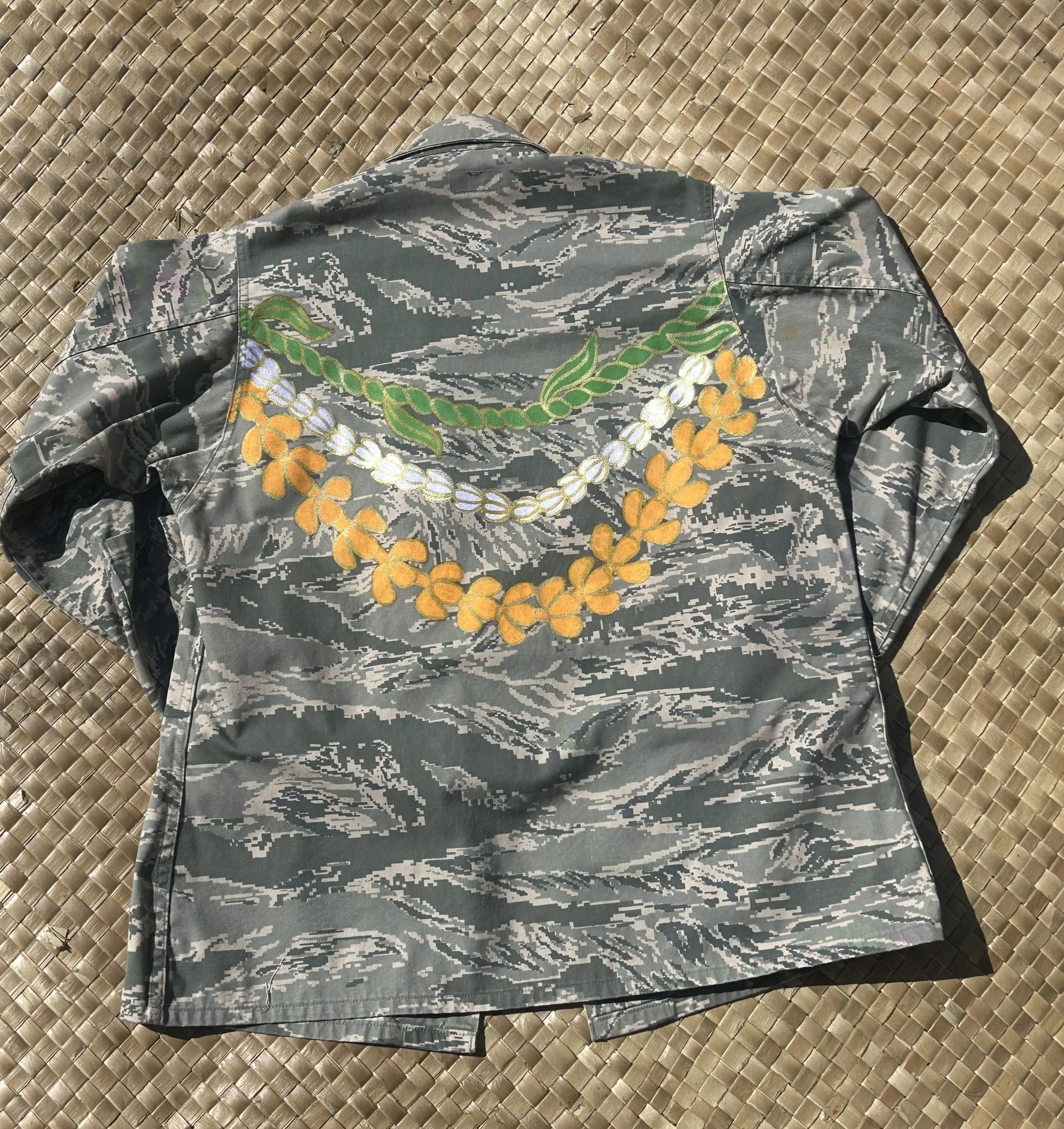 Handpainted Lei Camouflage jacket size 10 regular. Approximate measurements are PTP 22” across with a length of 30”. The jacket was designed with three handpainted lei Lāʻi (ti leaf), Pikake, and Puakenikeni across the back.