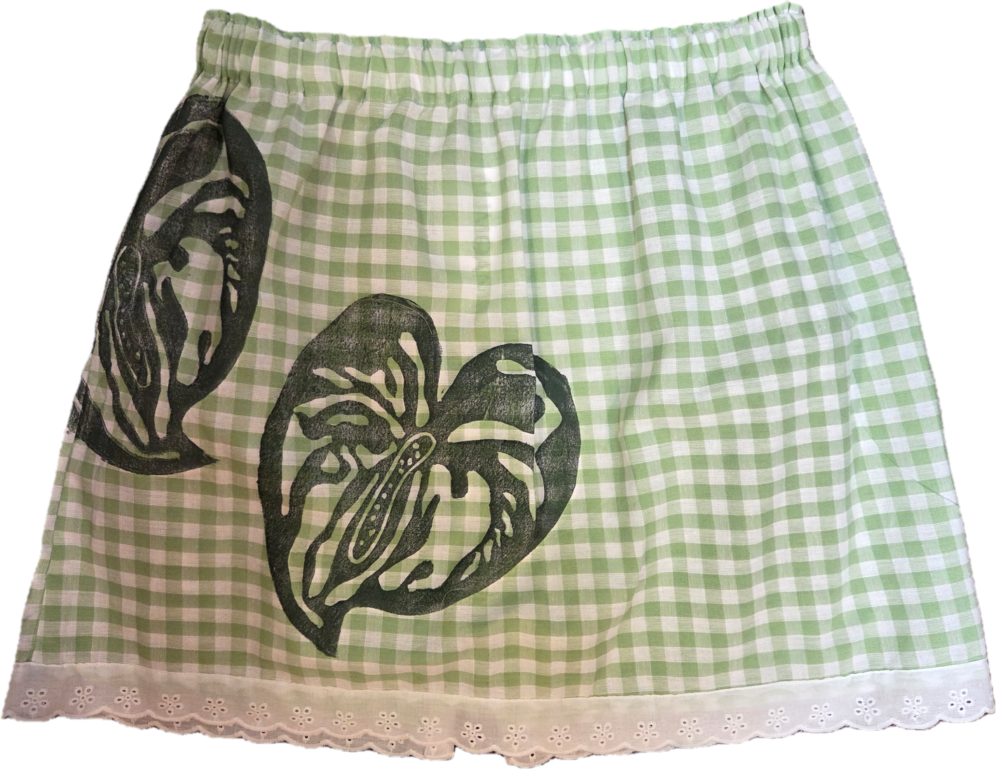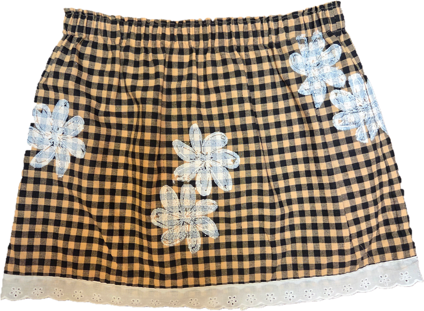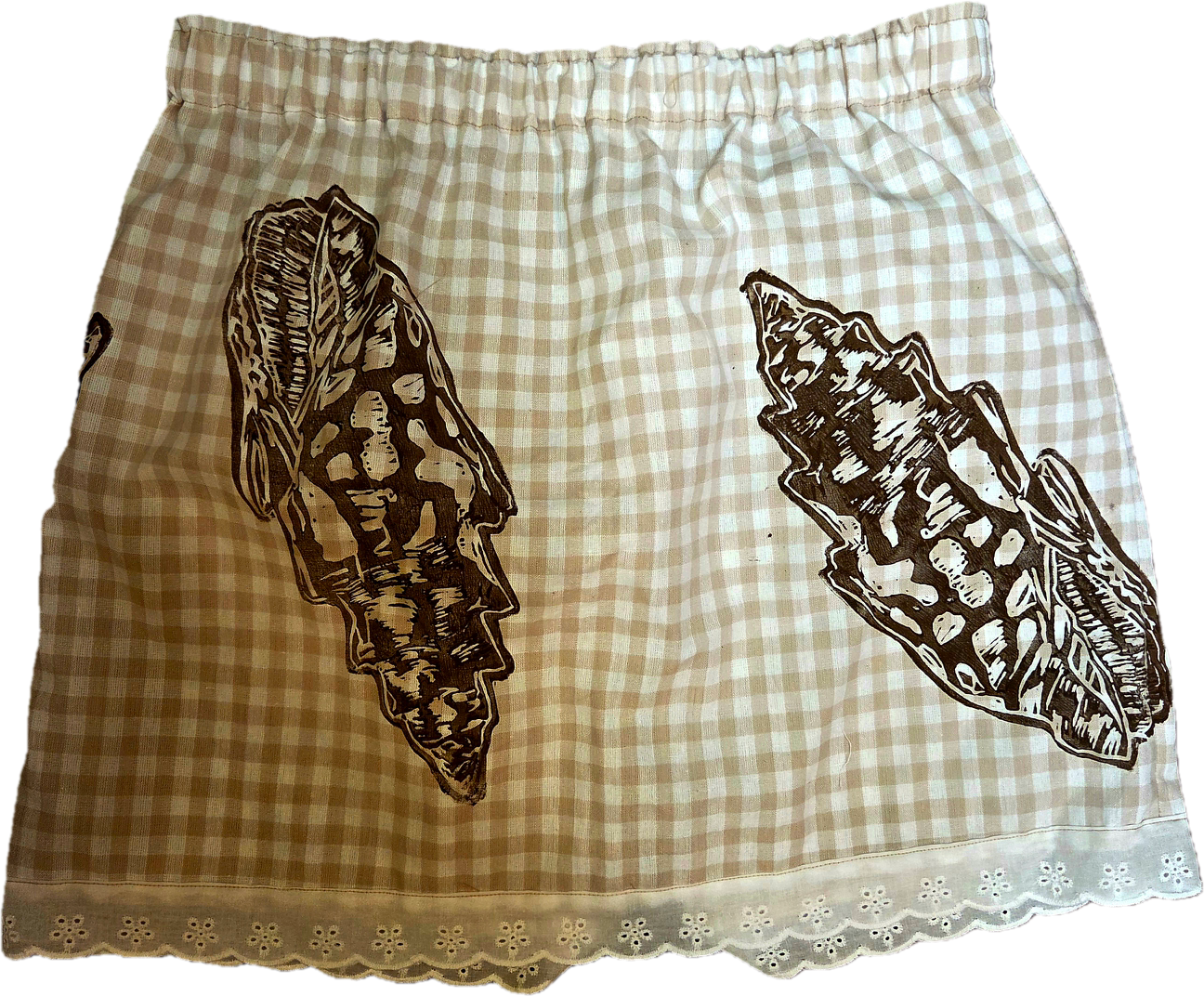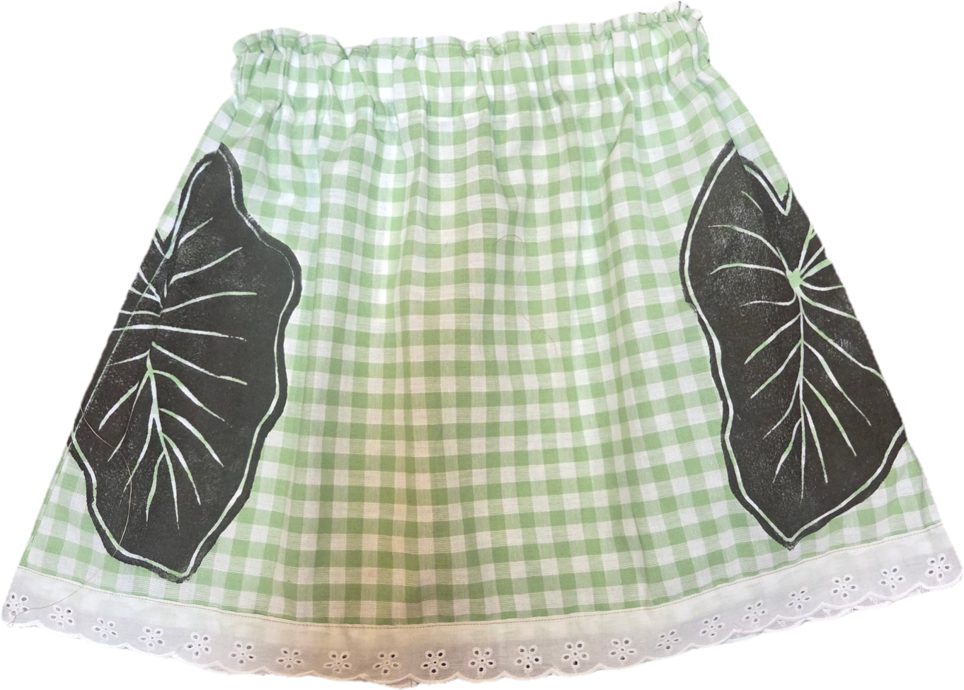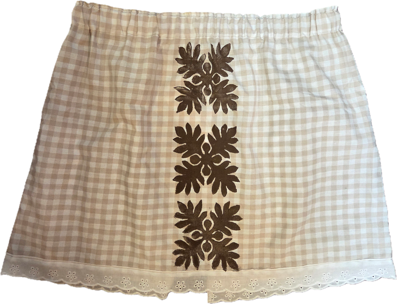 Wahine U’i Gingham Top sewn using a taupe and tan colored gingham fabric with a Miter Shell block print. There is white eyelet lace trim along the bottom edge and a peek a boo back for a bit of sass. The top is a size medium - large and measures at approximately 15 to 22” across the front with an elastic band. Please take note of sizing as all sales are final.