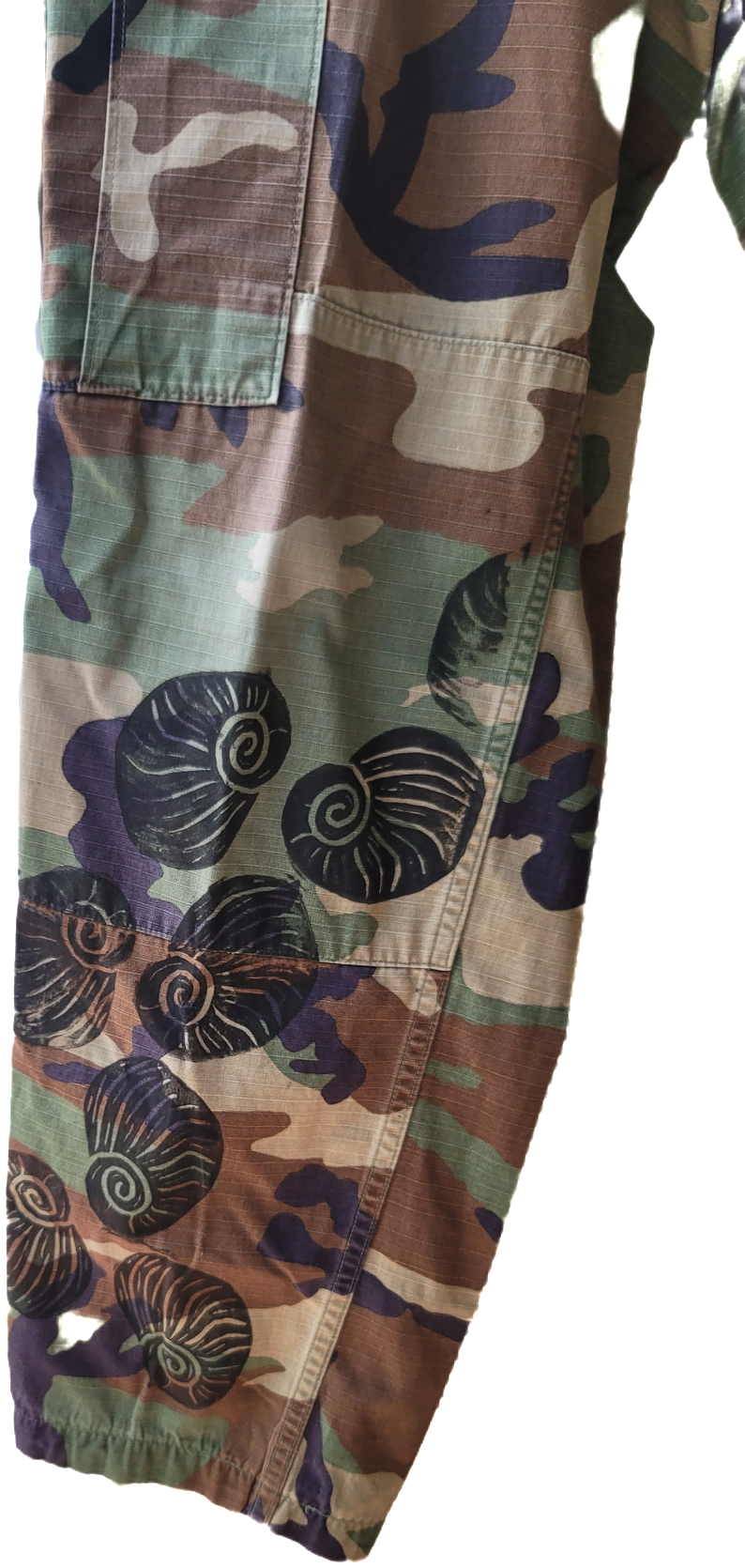 Refashioned camouflage pants, size small. regular. Approximate measurements are Inseam 29 1/2” to 32 1/2”, waist 27 to 31”. There are adjustable belt hoops on each side of the waist. Two side, front, and back pockets with tie bottoms. Block print Kūpeʻe shell in a black permanent ink.