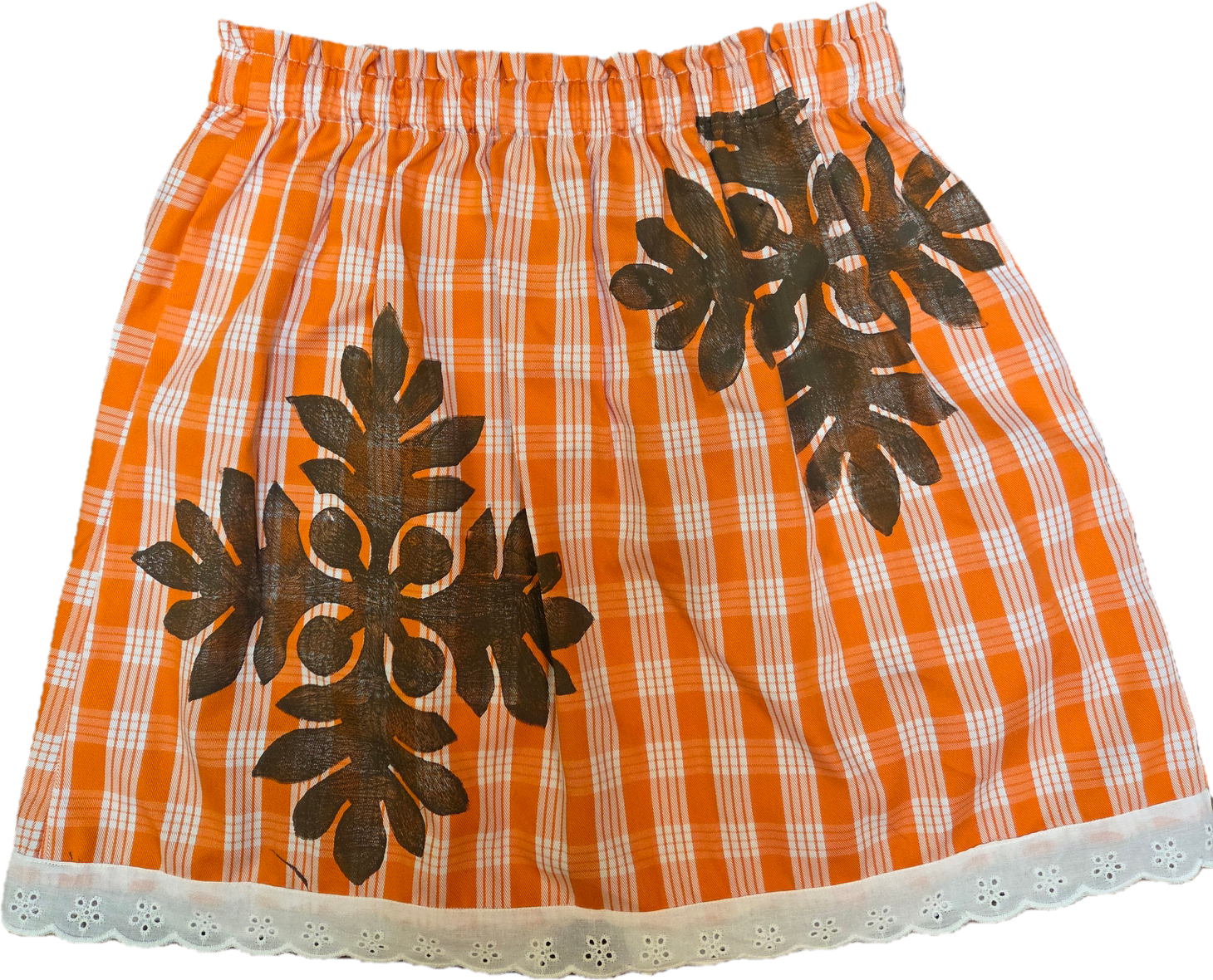 Wahine Uʻi Top is handmade using a Orange colored premium palaka fabric. The block printed Tiare flower is displayed across the front bottom. The top is a size extra small - small and has an elastic top that measures at approximately 13 to 18” across the front. There is a peek a boo back for an added touch of sass and a detailed white eyelet lace trim along the bottom. Please double check measurements prior to bidding as all sales are final.