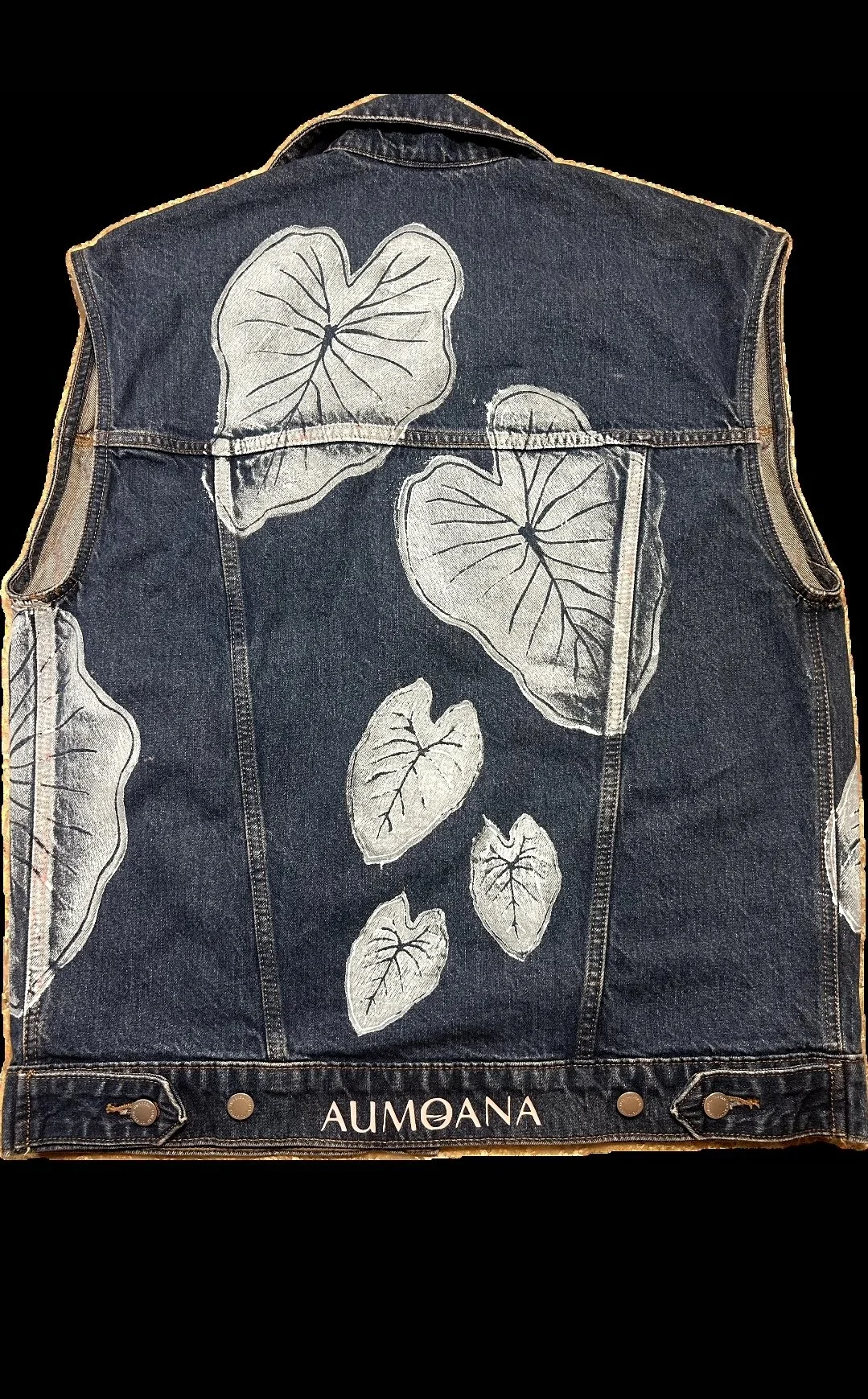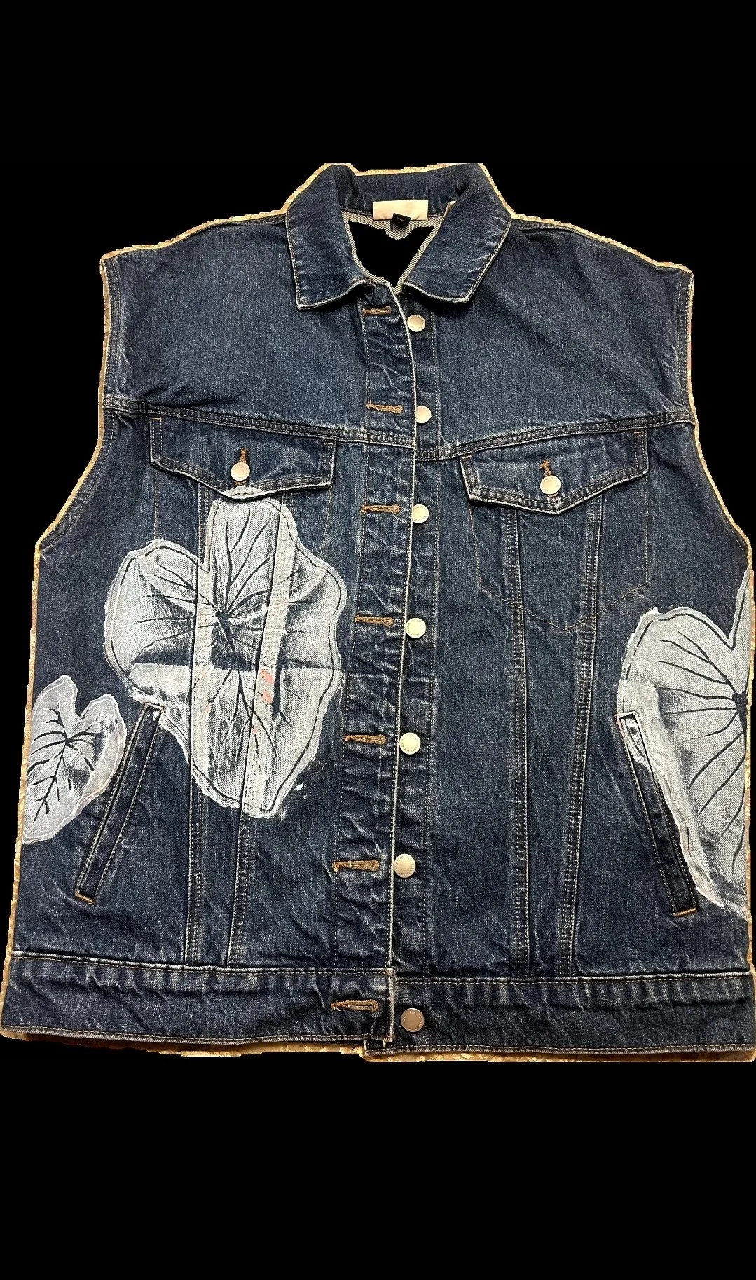 Vintage men’s denim vest with Kalo block print in white throughout vest. Vest is a size small.