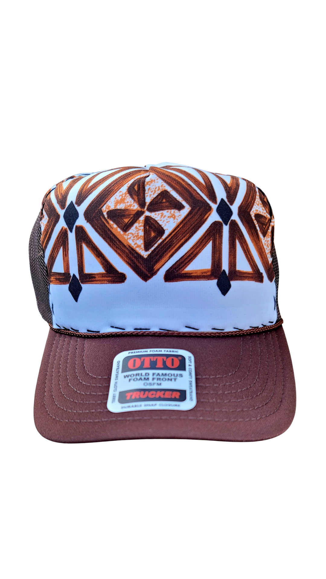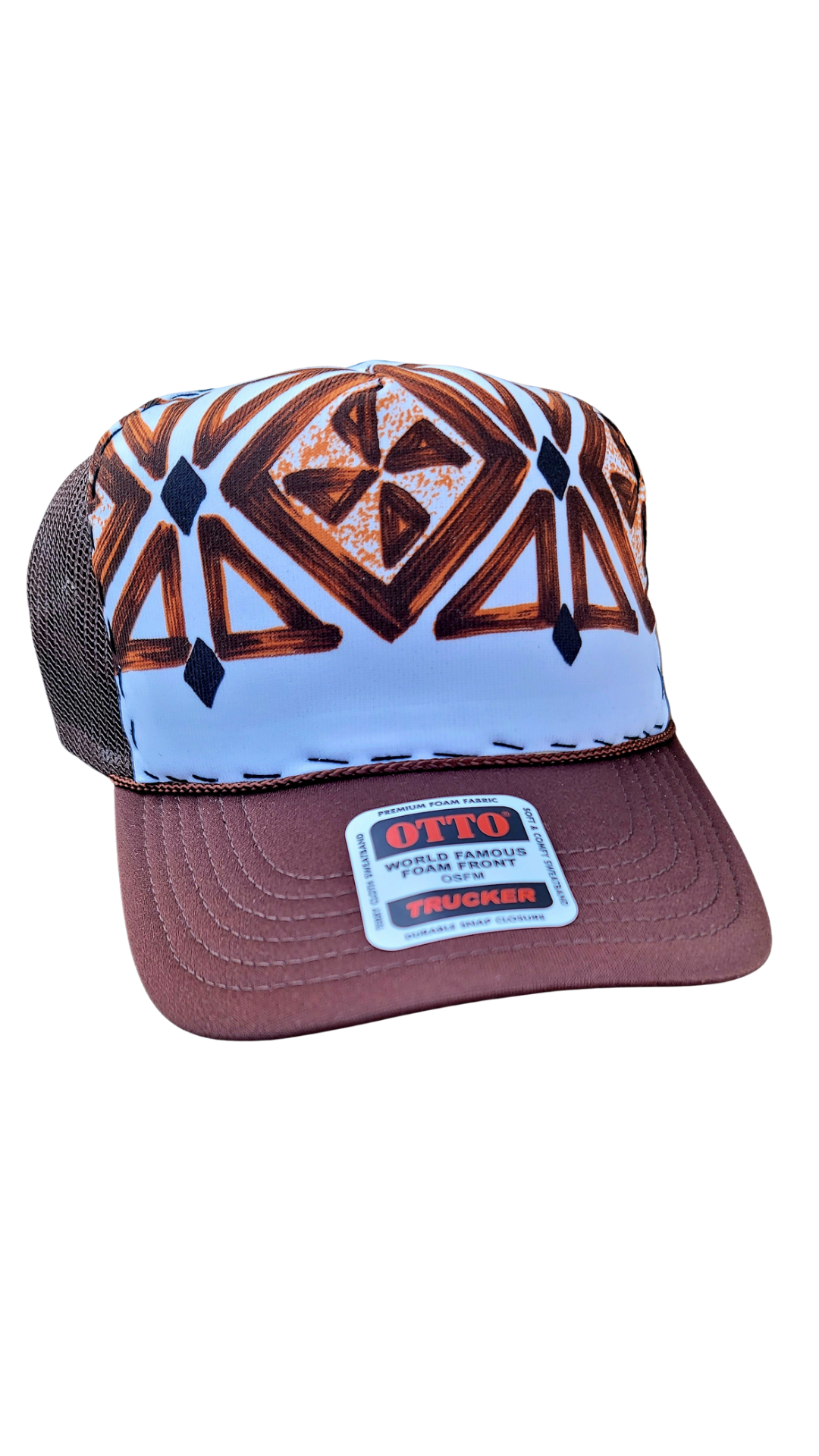 Hand Stitched Otto Trucker hat chocolate brown in color with a white and brown vintage tapa print. Hat is adjustable in size.