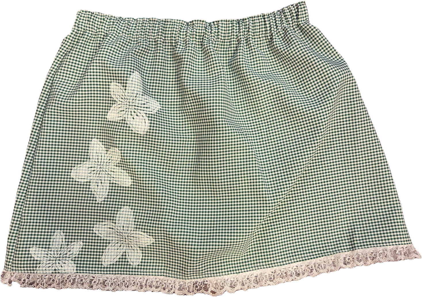 Size medium - large Introducing our block print Tiare Wahine Uʻi top. She is absolutely stunning, green gingham print with hand-done white Tiare block print. Each stamp is hand-carved by us displaying a distinct style. She is a size extra medium - large and has an elastic top that measures at approximately 15” to 21 1/2” across the front and 17” in length. There is a peek a boo back and a white eyelet lace trim.