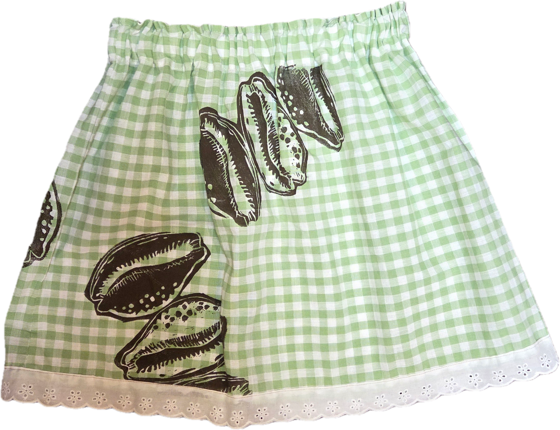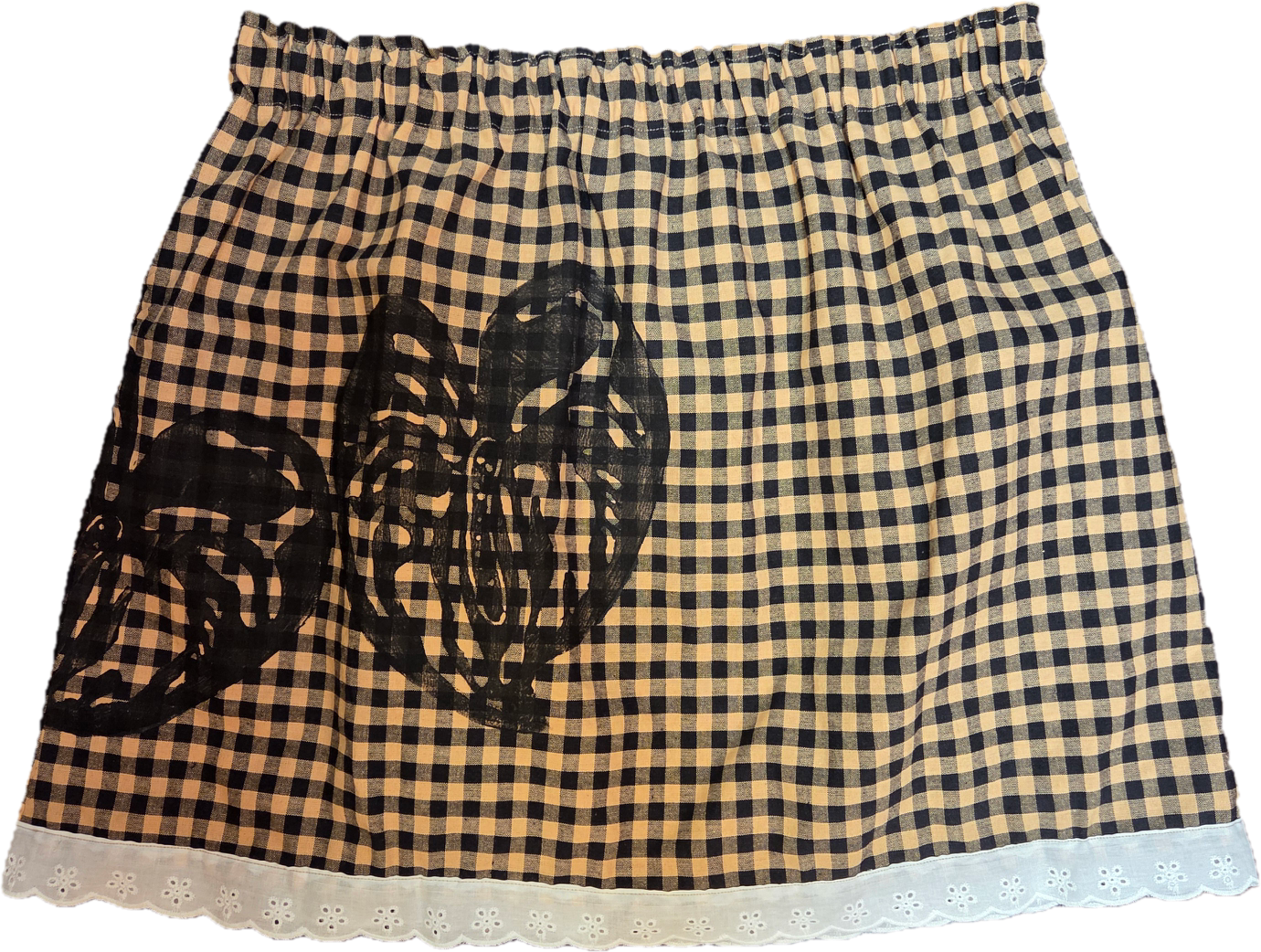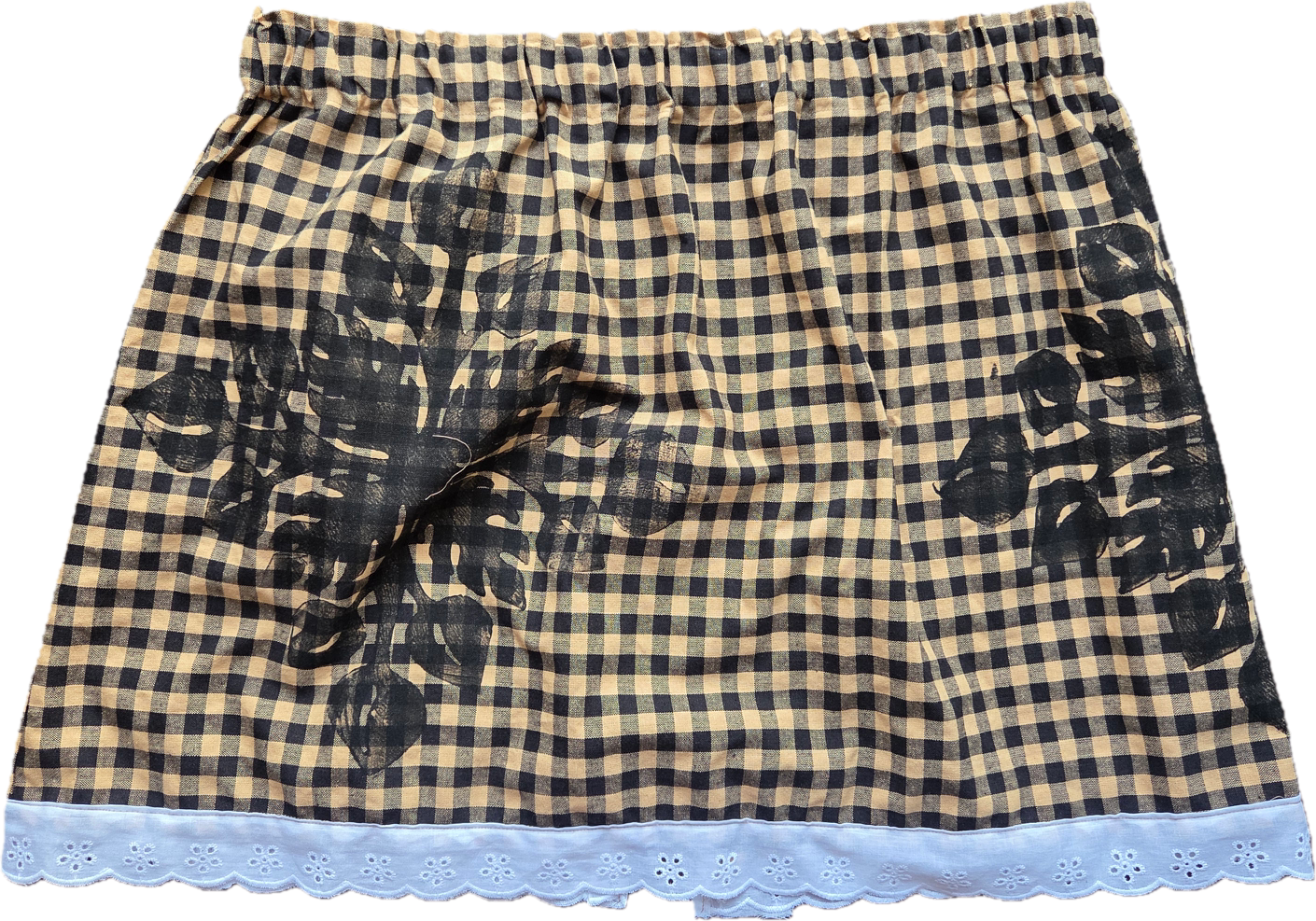 Wahine U’i Gingham Top sewn using a black and tan colored gingham fabric with Anthurium Kuiki block print. There is white eyelet lace trim along the bottom edge and a peek a boo back for a bit of sass. The top is a size large - extra large and measures at approximately 16 to 22” across the front with an elastic band. Please take note of sizing as all sales are final.